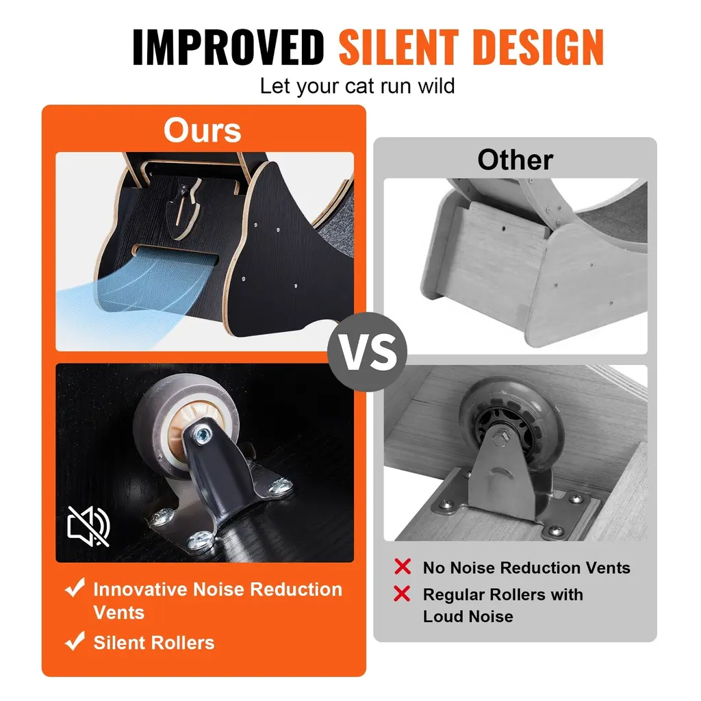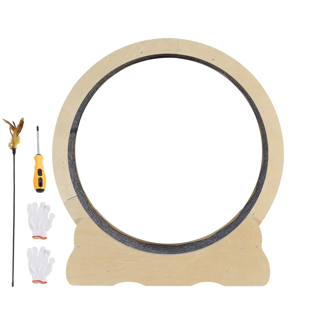 Built to Last and Secure: This cat exercise wheel is made from solid multi-layer wood (birch and poplar) with a 0.5"/12 mm thickness and an ultra-narrow 0.2" gap to prevent paw injuries. The widened base and running track deliver added stability. It offers many health advantages to cats, such as mitigating obesity risks and enhancing joint flexibility, ensuring their contentment. Tranquil and Noise Reduction: Equipped with an integrated silent wheel and a bottom noise-reduction, this double noise reduction design creates a quiet and pleasant exercising environment for your pets, while also improving the indoor atmosphere. Suitable for All Cat Sizes: For 43.3 inch option: With an external diameter of 43.3 in/1100 mm and an internal diameter of 39.37 in/1000 mm, this cat wheel accommodates cats of all sizes, supporting feline friends up to 25 lbs. For 35.8 inch option: With an external diameter of 35.8 in/910 mm and an internal diameter of 31.5 in/800 mm, this cat wheel accommodates cats of all sizes, supporting feline friends up to 13 lbs. For 29.5 inch option: With an external diameter of 29.5 in/750 mm and an internal diameter of 25.6 in/650 mm, this cat wheel accommodates cats of all sizes, supporting feline friends up to 8 lbs. It allows your cats to stretch and roam freely, enabling them to release their energy to the fullest. User-Friendly Design: Easy installation with pre-installed expansion screws and wheel, saving you valuable time. Included accessories like gloves, a screwdriver, and a cat teaser add extra convenience. This cat treadmill is a breeze to clean with a non-scratch detachable looped mat, easily spot-cleanable with a cloth or sponge. Versatile Cat Wheel: Featuring a locking mechanism to keep it steady, this cat running wheel is adaptable for interactive cat play, as a cat resting place, and as a furniture piece. It can be set to a stationary mode for cats running and spinning, allowing them to climb and take a nap. Cats can also frolic, chase, and keep themselves entertained! Package Content 1 x Cat Exercise Wheel 1 x Gloves 1 x Screwdriver 1 x Cat Teaser