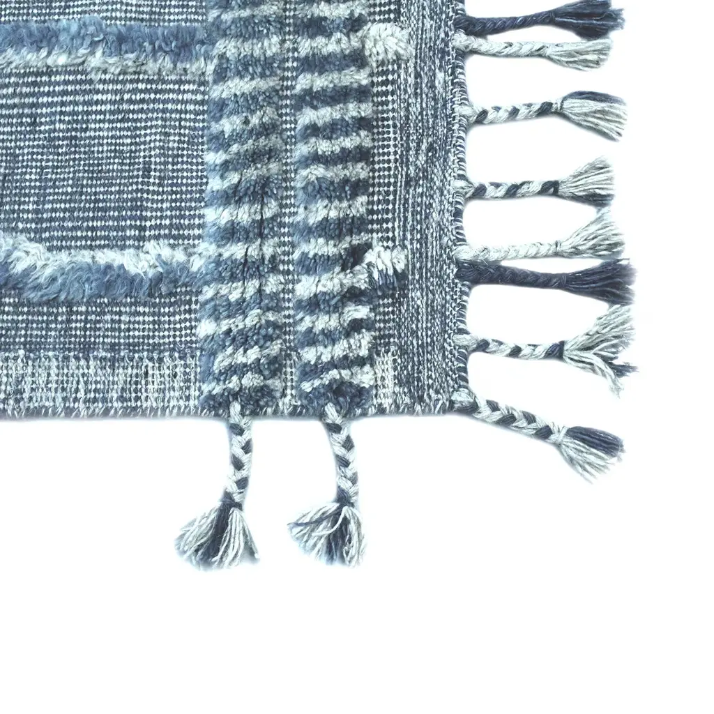 A gray and navy blue carpet that recalls the style of the Berber clans of North Africa. It gives off a dynamic and 3D vibe thanks to the alternation of colors and heights of the surface. It is made with a mix of New Zealander wool and cotton. This item's dimensions can be customized upon request.