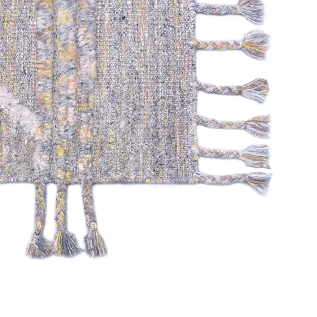 This is an original carpet that recalls the textile tradition of the Berber clans, fully handmade using New Zealander wool and cotton. The dynamic appearance of the texture is given by the alternation of gray and gold tones and fleece heights. The dimensions of this item can be customized upon request.