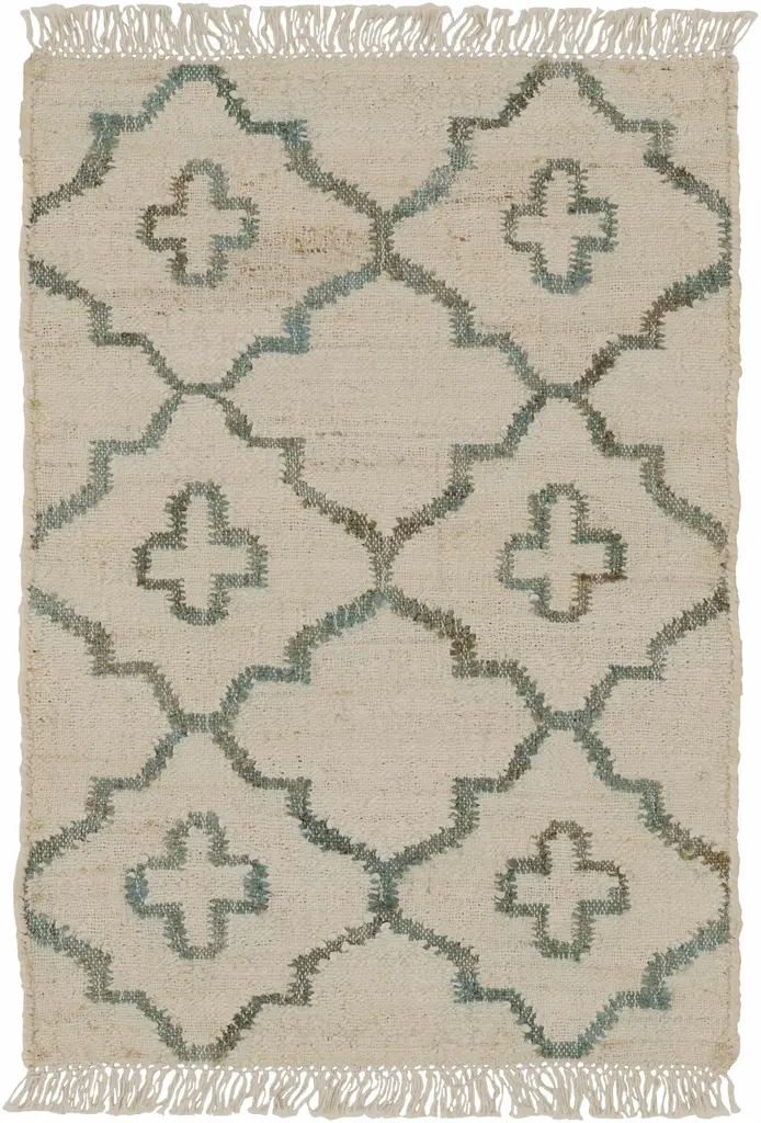 Collection: Coffeyville Colors: Cream, Sage, Ivory Construction: Hand Woven Material: 100% Jute Pile: No Pile Styles: Natural Fibers Made In: India Thickness: 0.07" Fringe Length: 1.5" Price Range: $$$$$ (Affordable)