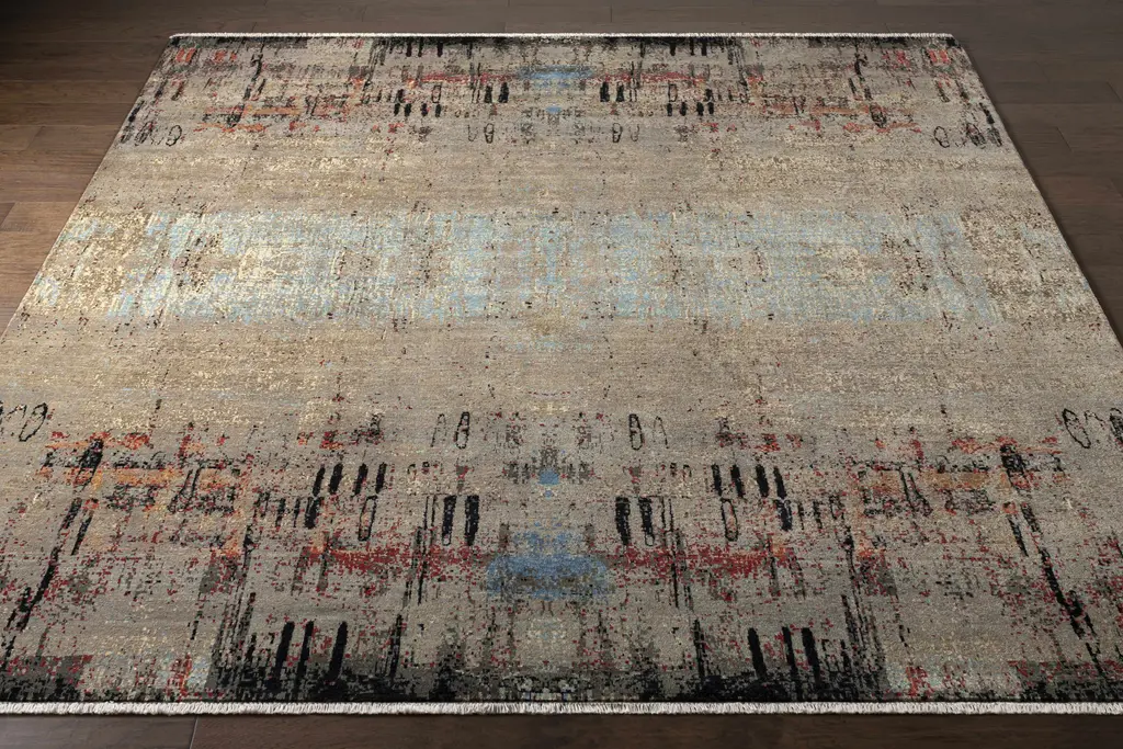 Collection: Coudersport Colors: Tan, Black, Charcoal, Cream, Dusty Coral, Olive, Sky Blue, Brick Red, Dark Pink Construction: Hand Knotted Material: 80% Wool,20% Silk Pile: Low Pile Pile Height: 0.19" Styles: Contemporary Made In: India Thickness: 0.24" Fringe Length: 1" Price Range: $$$$$ (Premium)