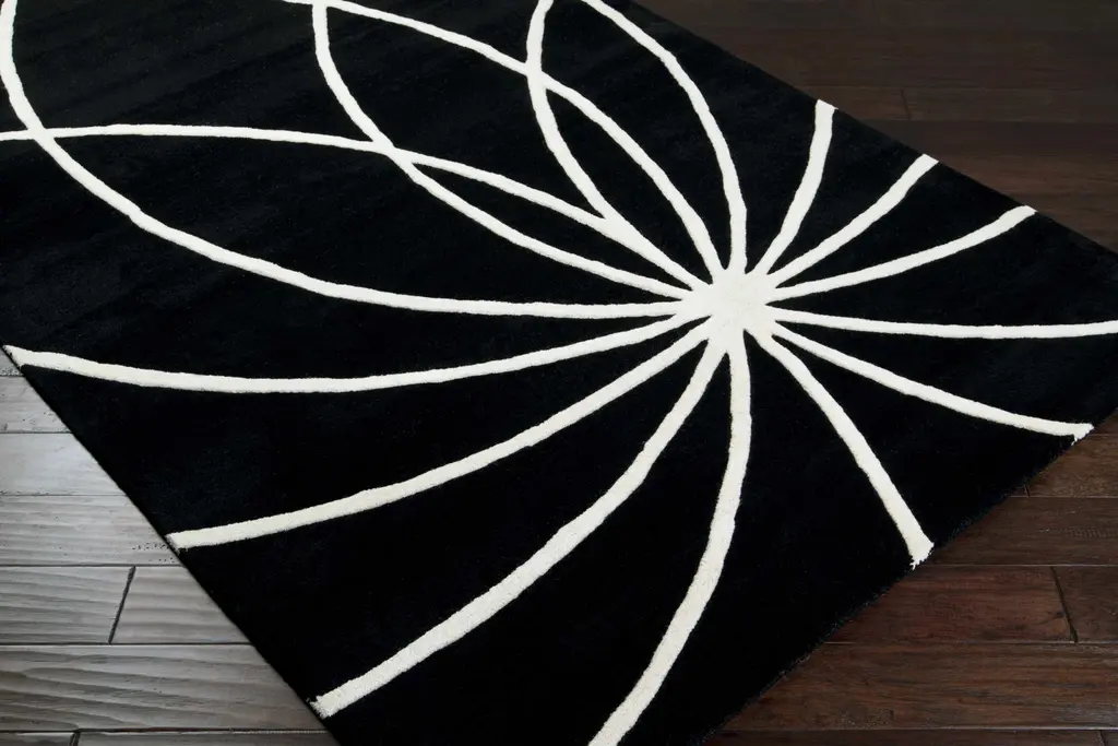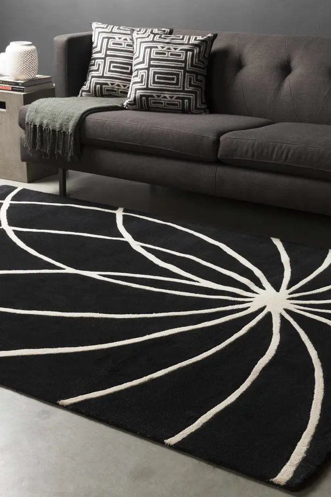 Collection: Harlem Colors: Black, Cream Construction: Hand Tufted Material: 100% Wool Pile: Medium Pile Pile Height: 0.39" Styles: Contemporary Backing: Canvas Made In: India Thickness: 0.86" Price Range: $$$$$ (Affordable)