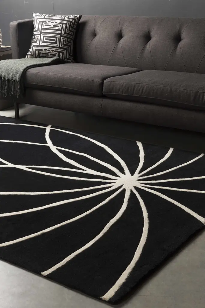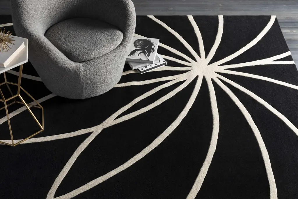Collection: Harlem Colors: Black, Cream Construction: Hand Tufted Material: 100% Wool Pile: Medium Pile Pile Height: 0.39" Styles: Contemporary Backing: Canvas Made In: India Thickness: 0.86" Price Range: $$$$$ (Affordable)