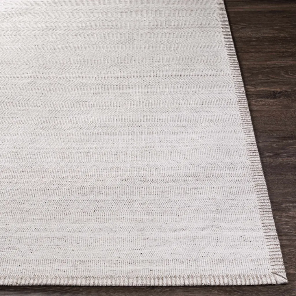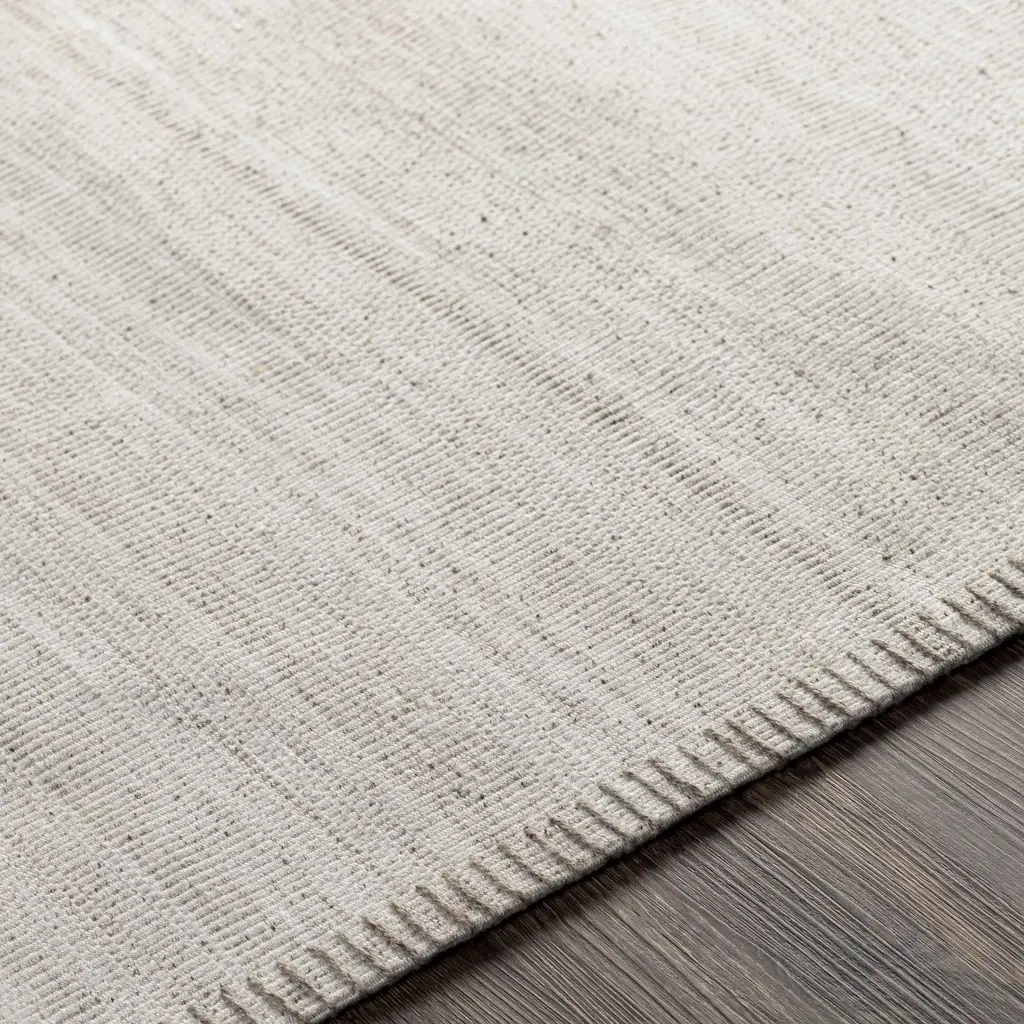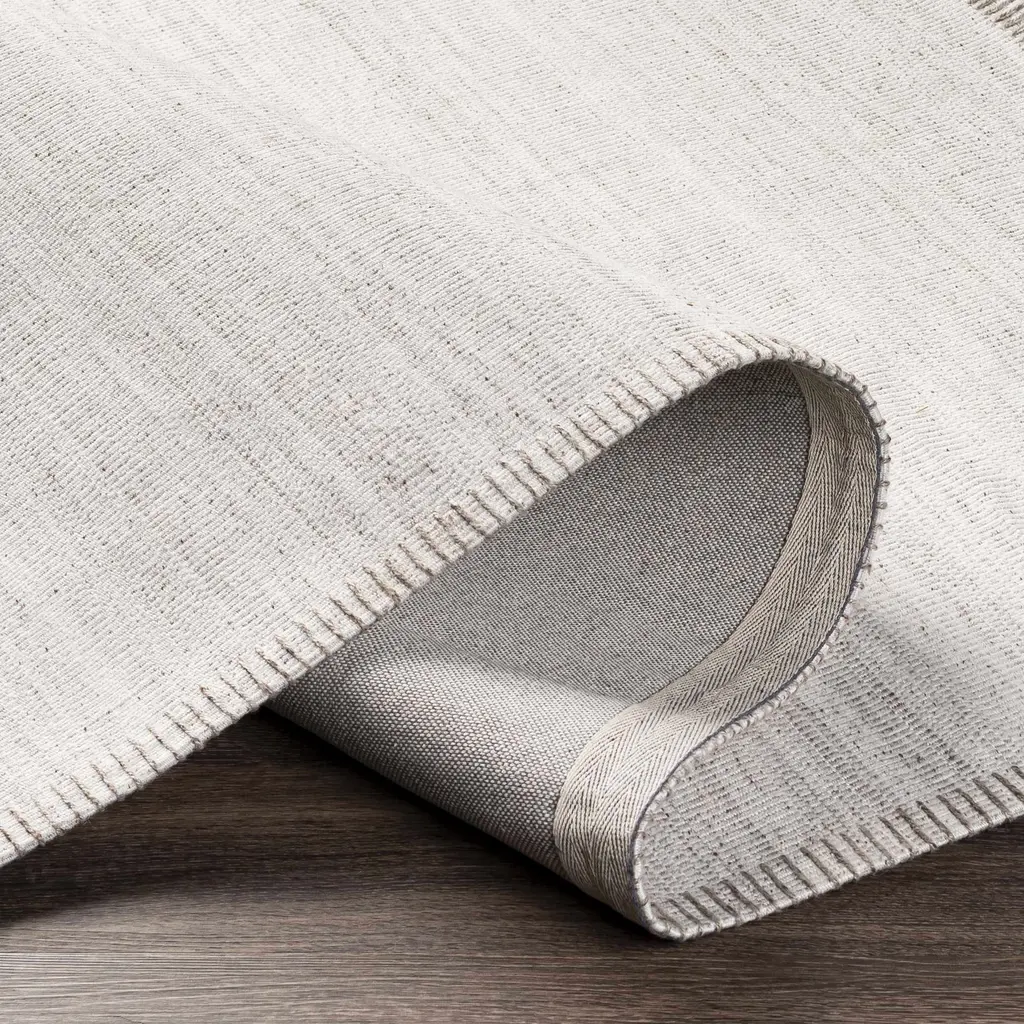 Collection: Denison Colors: Cream, Medium Gray Construction: Hand Woven Material: 100% Viscose Pile: Medium Pile Pile Height: 0.25" Styles: Transitional,Bohemian Backing: Canvas Made In: India Thickness: 0.25" Price Range: $$$$$ (Affordable)