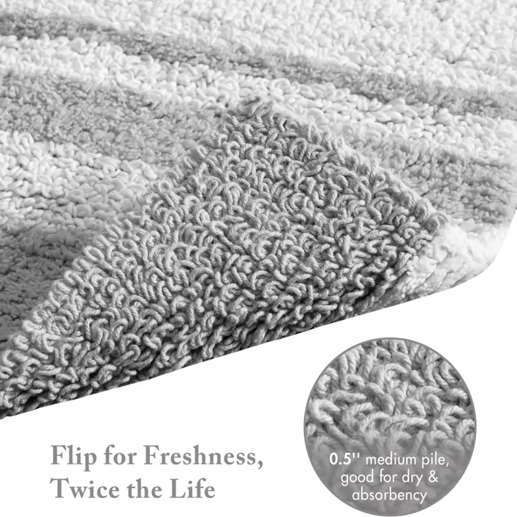 Elevate your daily routine with this reversible cotton bath rug that combines spa luxury with practical functionality. The thoughtful dual-sided design offers both plush comfort and gentle foot stimulation, while the premium cotton construction delivers exceptional absorbency. Perfect for adding a touch of boutique hotel elegance to your bathroom, this rug transitions seamlessly between styles with its reversible pattern options.