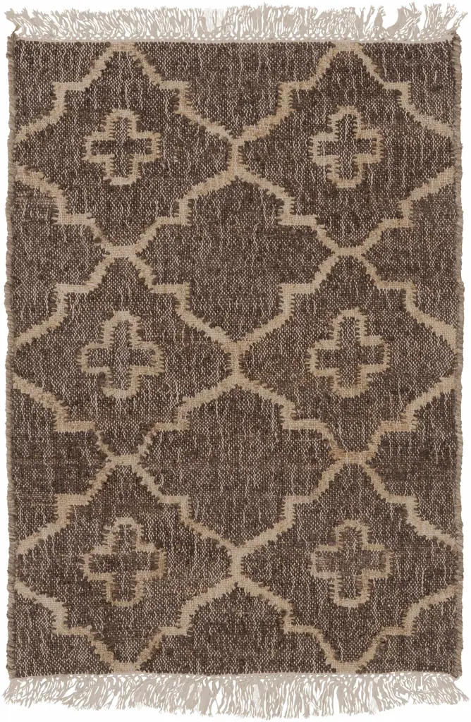 Collection: Gotebo Colors: Dark Brown, Cream, Tan Construction: Hand Woven Material: 100% Jute Pile: No Pile Styles: Natural Fibers Made In: India Thickness: 0.07" Fringe Length: 1.5" Price Range: $$$$$ (Affordable)
