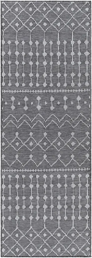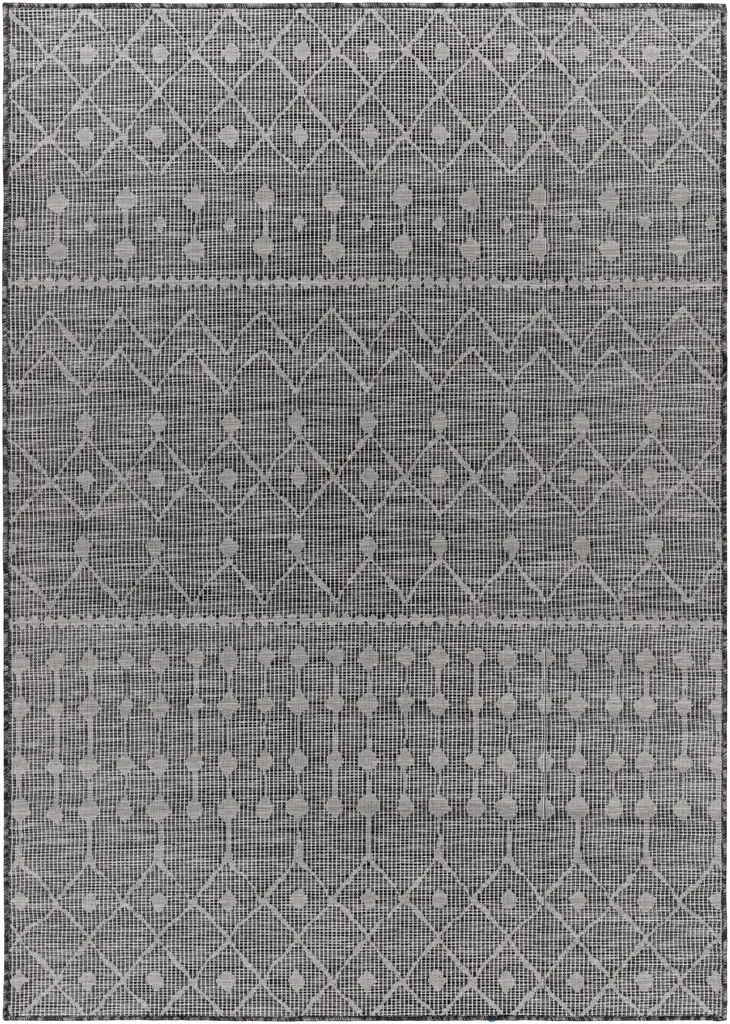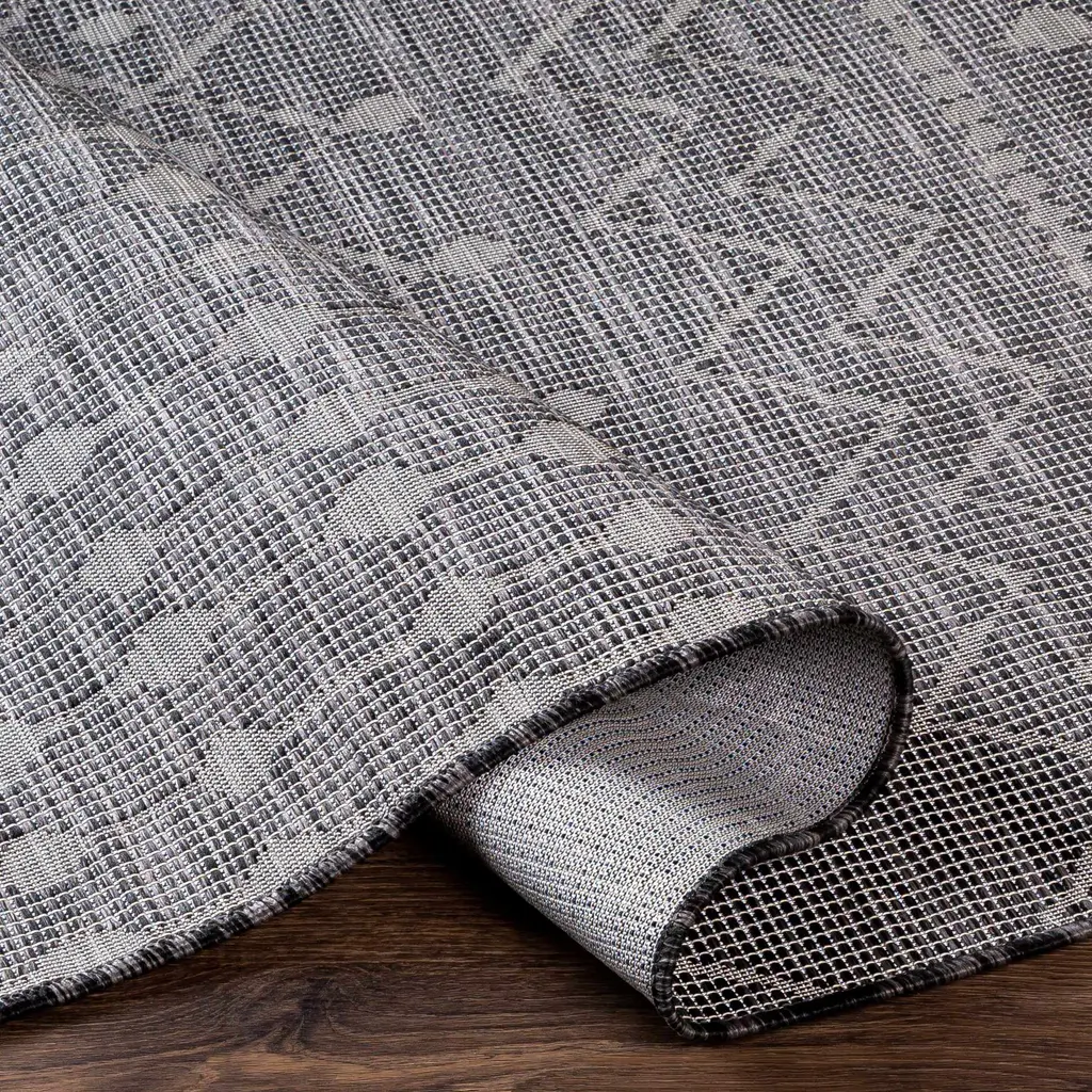 Collection: Hamel Colors: Black, Medium Gray Construction: Machine Woven Material: 100% Polypropylene Pile: No Pile Styles: Transitional,Bohemian Outdoor Safe: Yes Made In: Turkey Thickness: 0.16" Price Range: $$$$$ (Most Affordable)