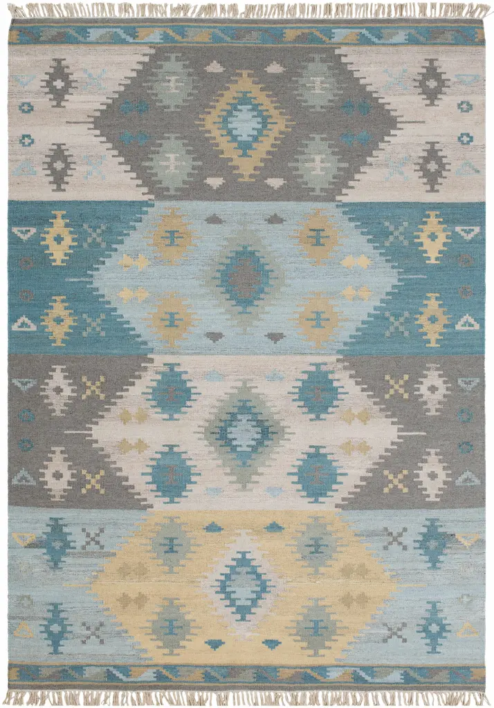 Collection: Heth Colors: Beige, Blue, Medium Brown, Pale Blue, Tan, Medium Gray Construction: Hand Woven Material: 100% Wool Pile: No Pile Styles: Bohemian/Global Made In: India Thickness: 0.2" Fringe Length: 1.5" Price Range: $$$$$ (Affordable)