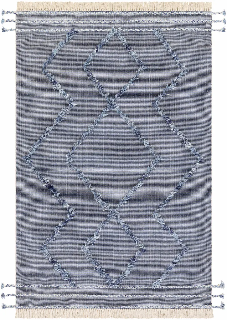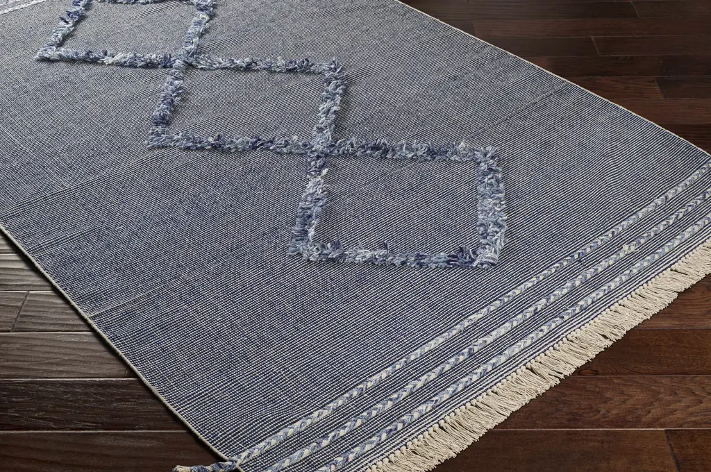 Collection: Lavington Colors: Denim, Off White, Sky Blue, Navy, Peach Construction: Hand Woven Material: 60% Cotton,40% Polyester Pile: No Pile Styles: Transitional,Bohemian Made In: India Thickness: 0.19" Fringe Length: 3" Price Range: $$$$$ (Most Affordable)