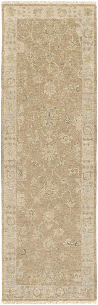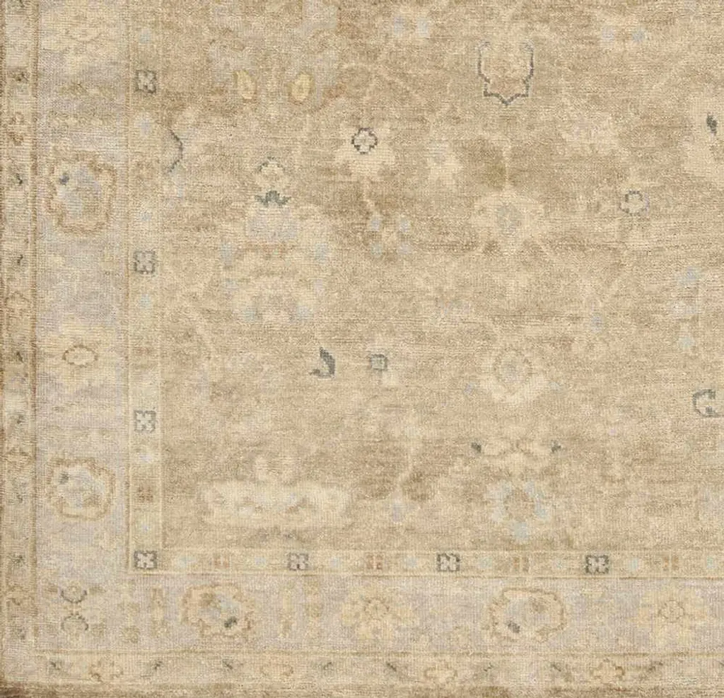 Collection: Lockney Colors: Pale Blue, Beige, Charcoal, Tan, Dark Red, Teal, Peach, Slate Blue Construction: Hand Knotted Material: 100% NZ Wool Pile: Medium Pile Pile Height: 0.24" Styles: Traditional Made In: India Thickness: 0.32" Fringe Length: 1.5" Price Range: $$$$$ (Affordable)