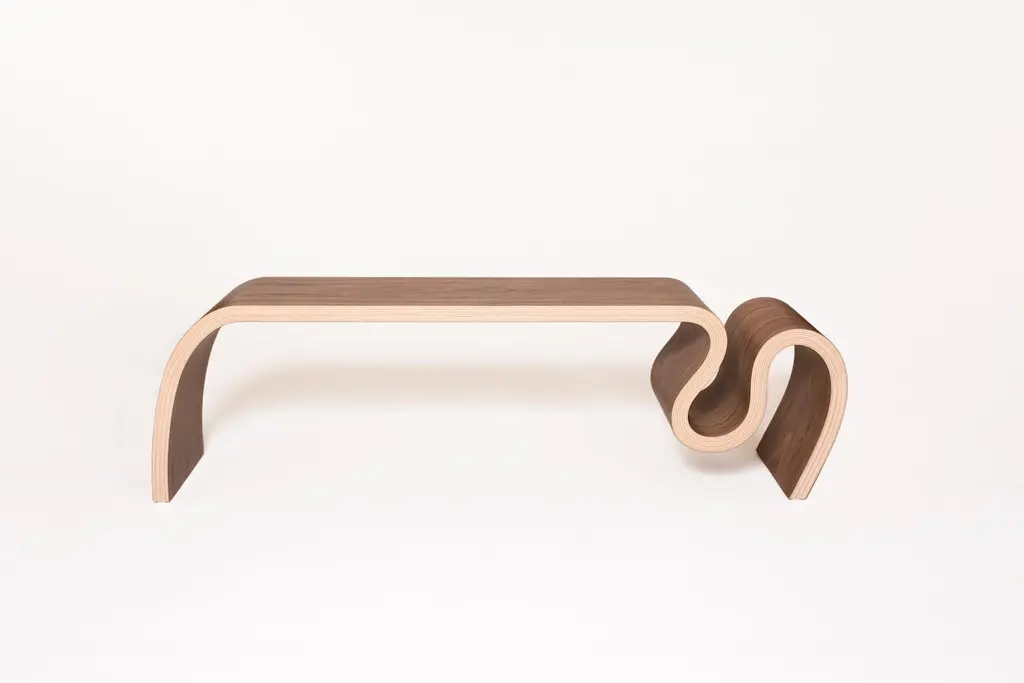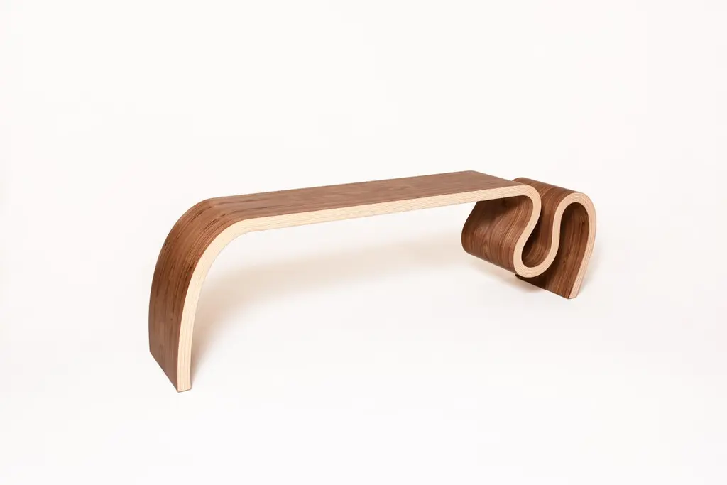 This bench is made with laminated bent plywood with several wood veneer options.. The one showed on the pictures is made with walnut veneer with an oil finish. It can also be finished with lacqer, that would make it looks a bit lighter.