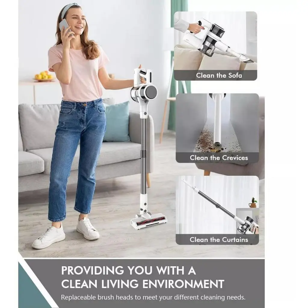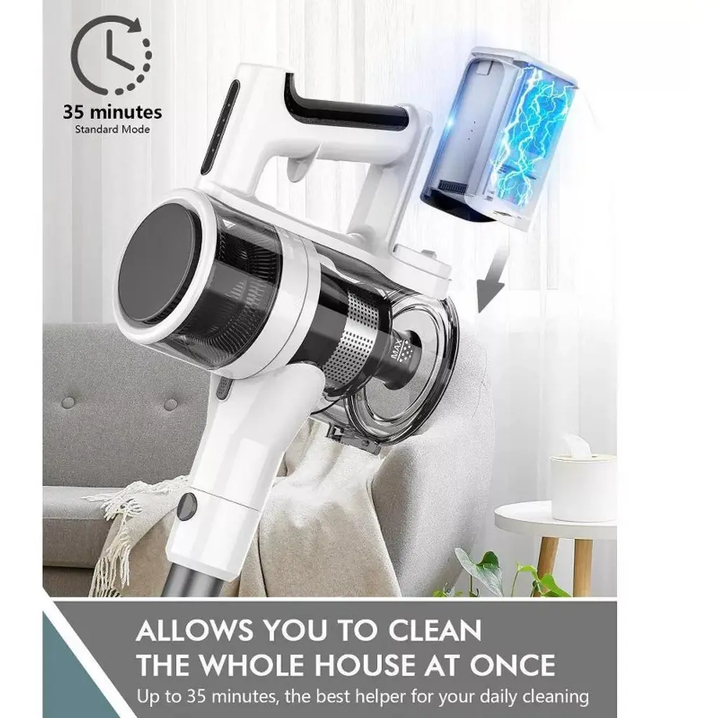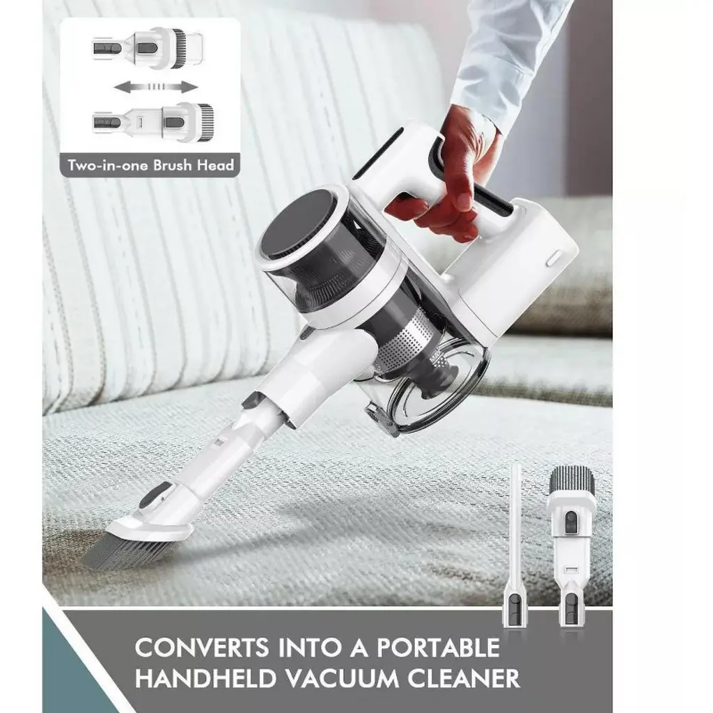 This cordless stick vacuum cleaner easily handles household cleaning needs with 250W power and 2 speed modes (23Kpa and 10Kpa). The flexible brush head is designed to swing 180° left and right and 90° up and down to reach every corner with ease. Handheld mode with 2-in-1 long flat brush makes cleaning ceilings, windows or cars easy. Low noise below 75dB, not disturbing family and pets. Works up to 35 minutes on a single charge.LED light illuminates dark corners for more thorough cleaning. Choose this stick vacuum cleaner and enjoy an efficient and convenient cleaning experience.