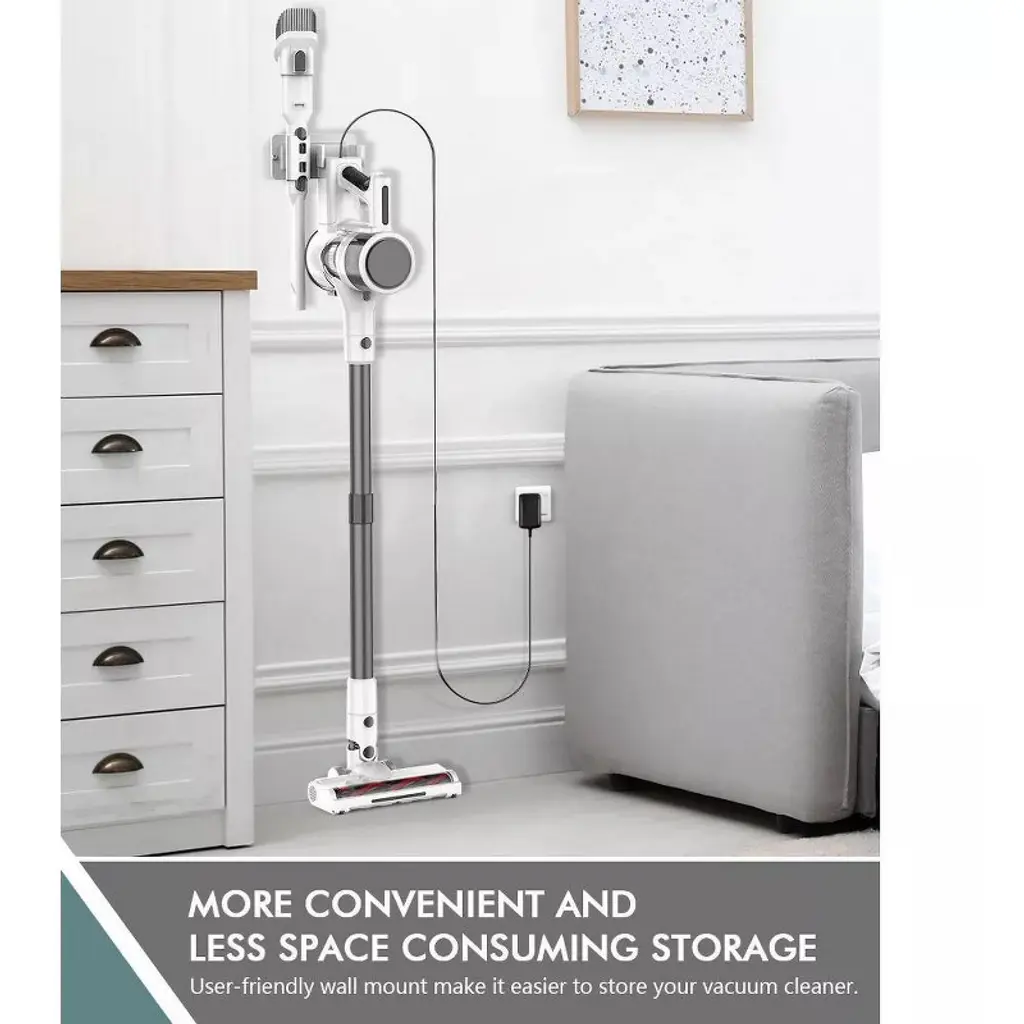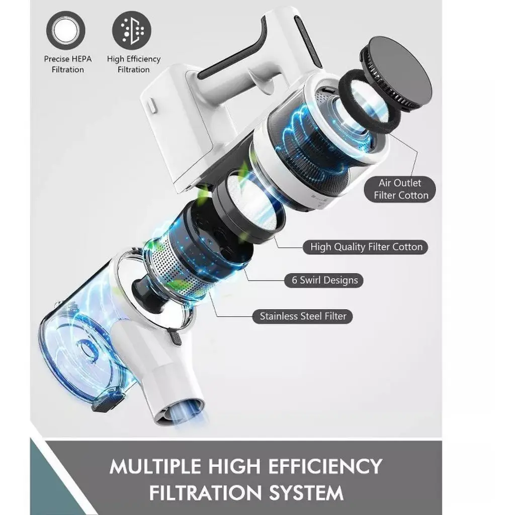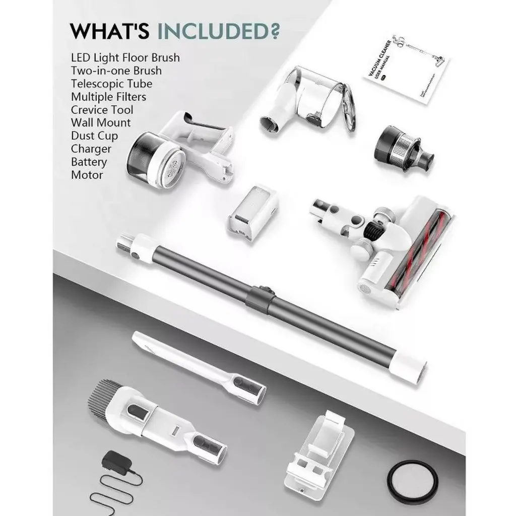 This cordless stick vacuum cleaner easily handles household cleaning needs with 250W power and 2 speed modes (23Kpa and 10Kpa). The flexible brush head is designed to swing 180° left and right and 90° up and down to reach every corner with ease. Handheld mode with 2-in-1 long flat brush makes cleaning ceilings, windows or cars easy. Low noise below 75dB, not disturbing family and pets. Works up to 35 minutes on a single charge.LED light illuminates dark corners for more thorough cleaning. Choose this stick vacuum cleaner and enjoy an efficient and convenient cleaning experience.