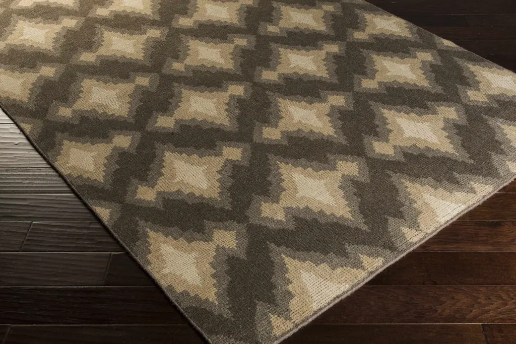 Collection: Marenisco Colors: Charcoal, Light Gray, Peach Construction: Hand Knotted Material: 100% Wool Pile: No Pile Styles: Contemporary Made In: India Thickness: 0.16" Price Range: $$$$$ (Affordable)