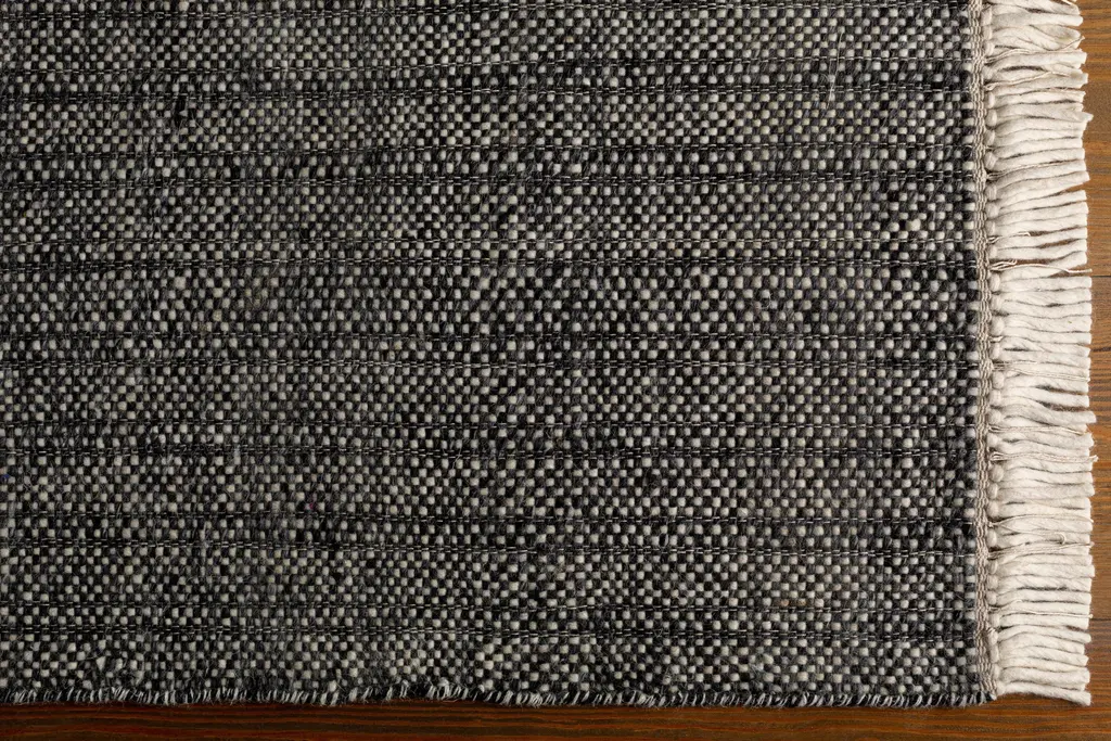 Collection: Morrisburg Colors: Charcoal, Cream, Medium Gray Construction: Hand Woven Material: 100% Wool Pile: No Pile Styles: Contemporary Made In: India Thickness: 0.5" Fringe Length: 3" Price Range: $$$$$ (Affordable)