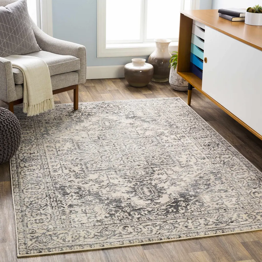 Collection: Motley Colors: Charcoal, Cream, Light Gray, Black, Beige Construction: Machine Woven Material: 100% Polypropylene Pile: Medium Pile Pile Height: 0.3" Styles: Contemporary Made In: Turkey Thickness: 0.49" Price Range: $$$$$ (Most Affordable)