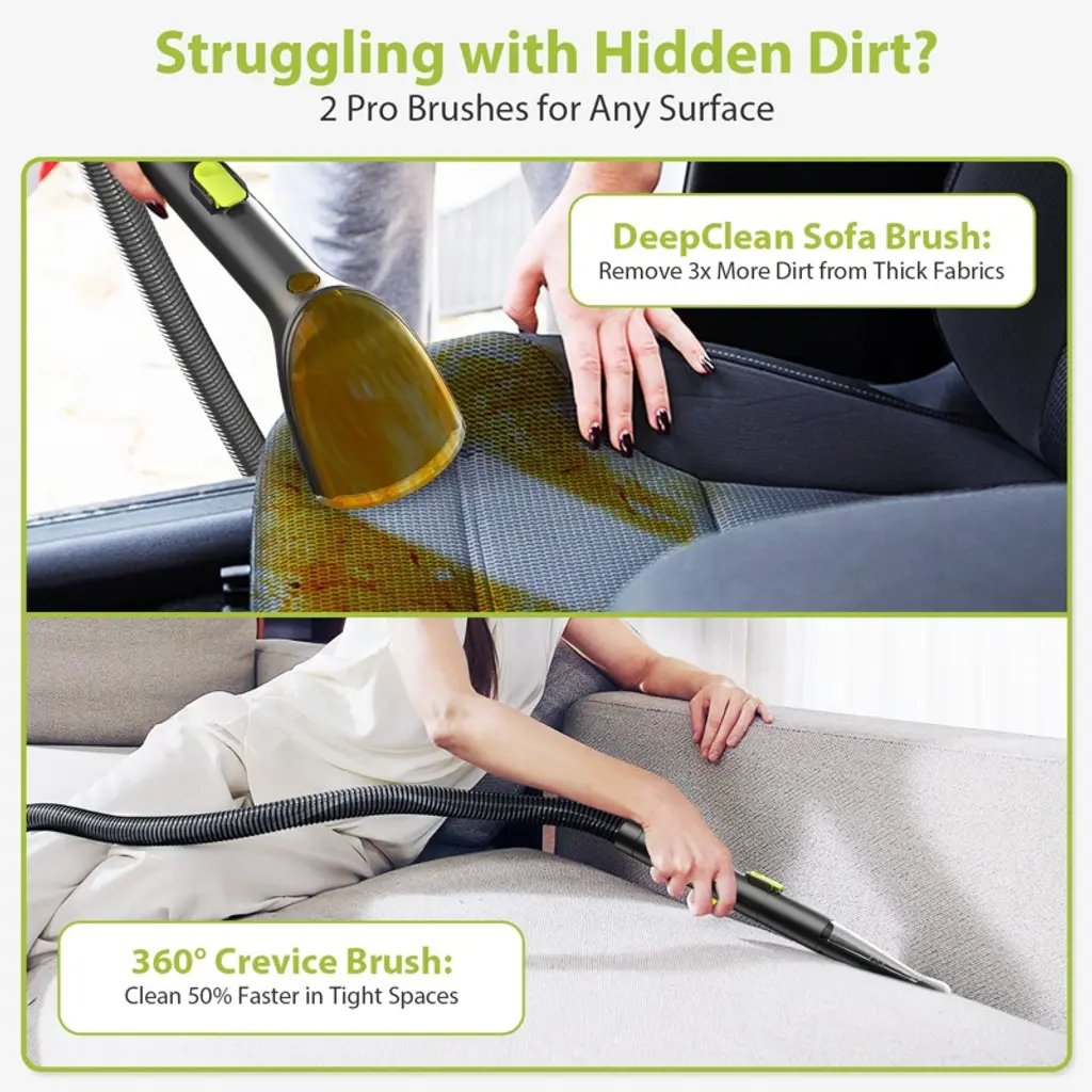 Eliminate Stains Instantly with Our Professional Upholstery Cleaner! Accidents happen – but stubborn stains don’t stand a chance! Our portable carpet cleaner delivers powerful 12KPa suction and deep-cleaning brushes to erase wine spills, pet messes, and ground-in dirt in seconds. Skip expensive rentals and messy DIY fixes – achieve spotless results at home with ease! 🚀 Why Smart Homes & Pet Owners Choose It: ✅ One-touch deep cleaning – spray, scrub, and away stains effortlessly ✅ Dual-tank system – keeps clean and dirty water separate for hygienic cleaning ✅ Extended reach – flexible hose + long cord for hassle-free maneuvering ✅ Fast-drying tech – removes moisture 3X faster than old-school methods 💡 Perfect for: Pet stains, sofa spills, car seats, rugs & more! Say goodbye to stains – and hello to a fresher home in minutes! ✨