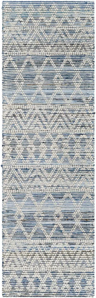Collection: Nala Colors: Navy, Light Blue, Charcoal, Medium Gray, Off White Construction: Hand Woven Material: 70% Cotton,30% Wool Pile: High Pile Pile Height: 0.79" Styles: Transitional,Bohemian Made In: India Thickness: 0.98" Price Range: $$$$$ (Affordable)