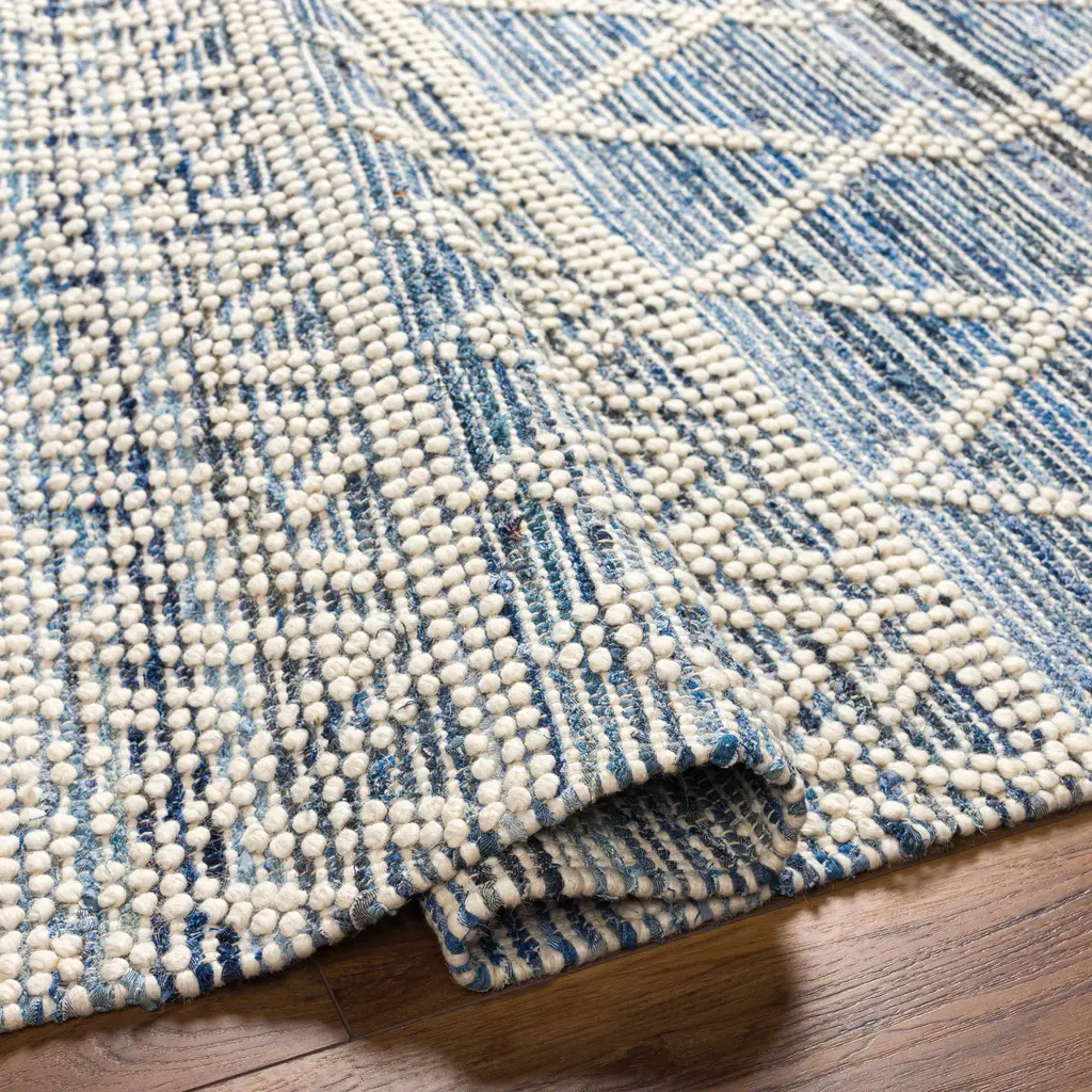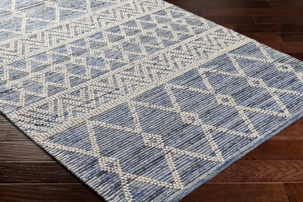 Collection: Nala Colors: Navy, Light Blue, Charcoal, Medium Gray, Off White Construction: Hand Woven Material: 70% Cotton,30% Wool Pile: High Pile Pile Height: 0.79" Styles: Transitional,Bohemian Made In: India Thickness: 0.98" Price Range: $$$$$ (Affordable)