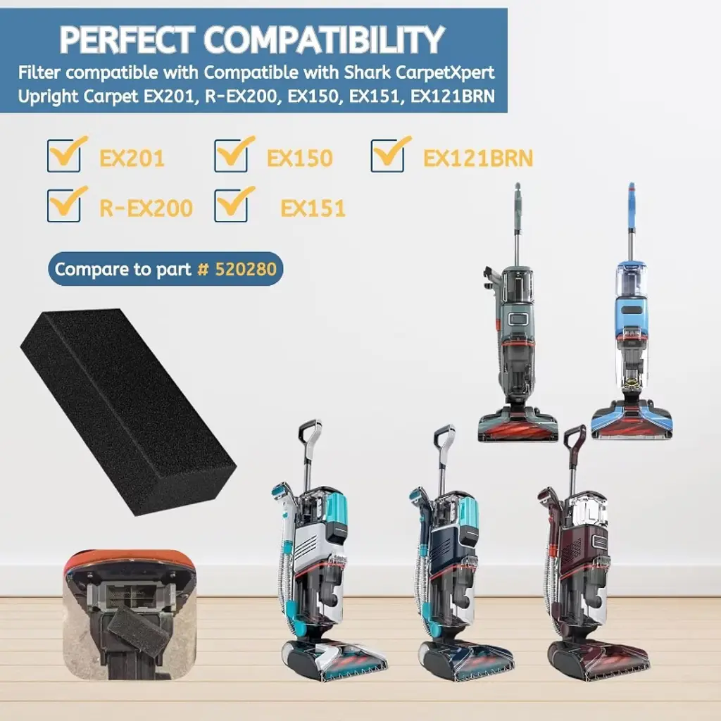 Premium pre-motor foam filter replacement compatible with Shark CarpetXpert EX201 EX150 EX150C EX200 EX200C EX300 Upright Deep Carpet Cleaners. Compare to Part # EX201 foam filter. The EX201 filter efficiently captures hair, dander, dust, sand, and other debris from dirty water tanks, helping to keep your home clean and allergen-free. These filter sponges are both reusable and washable, allowing for regular cleaning that boosts the effectiveness of your carpet cleaning machine while protecting its motor. Dimension: 1" x 2" x 0.5". 12 Packs included.