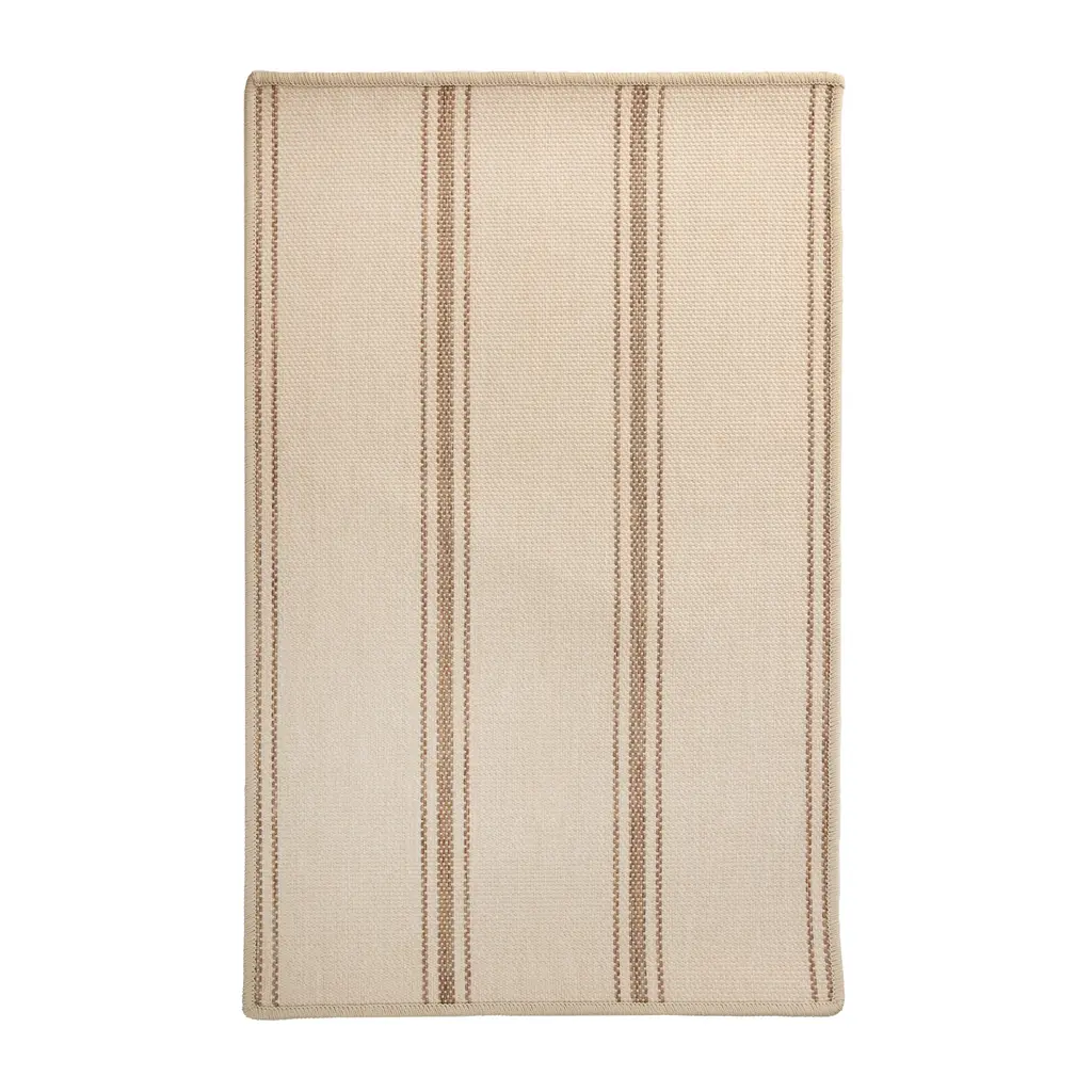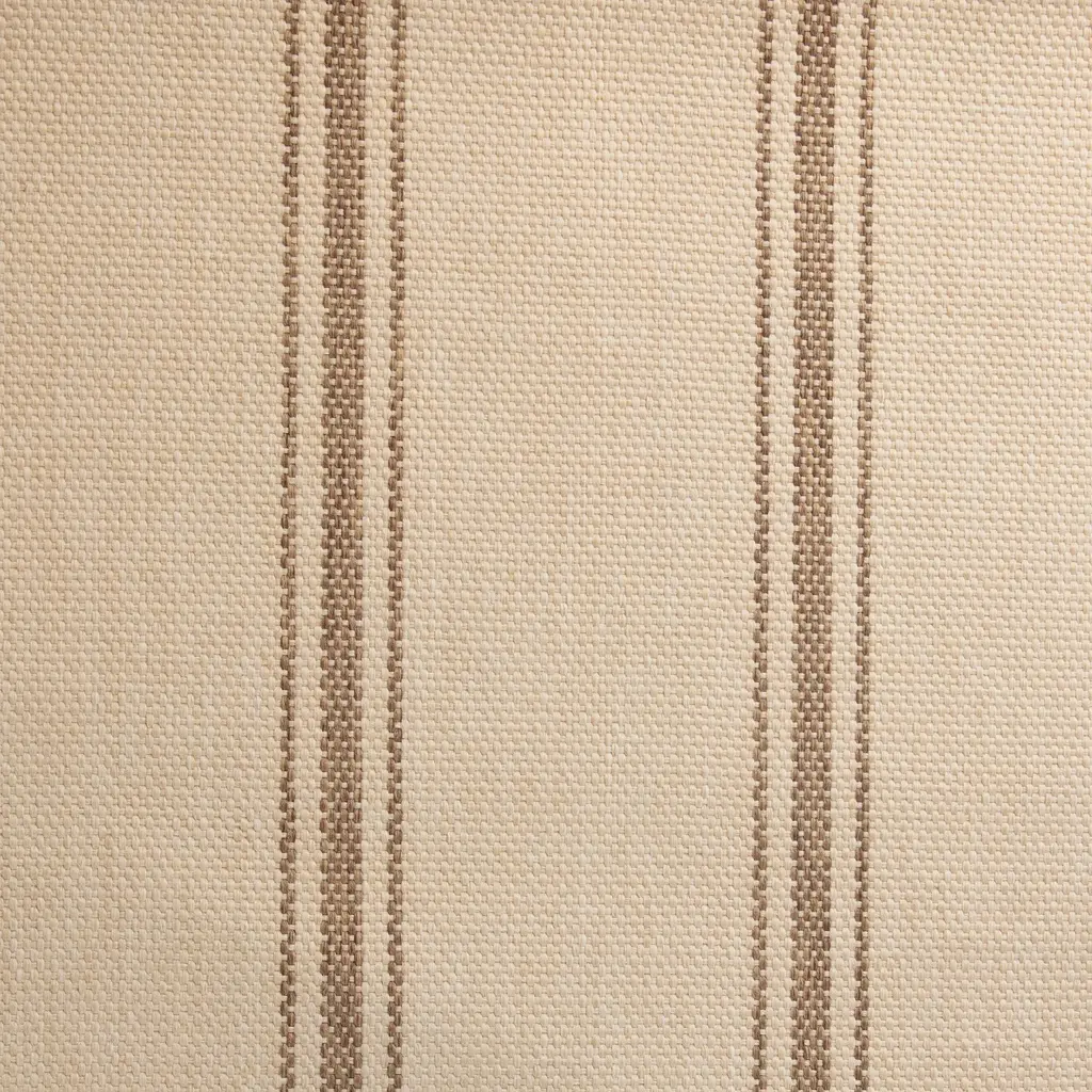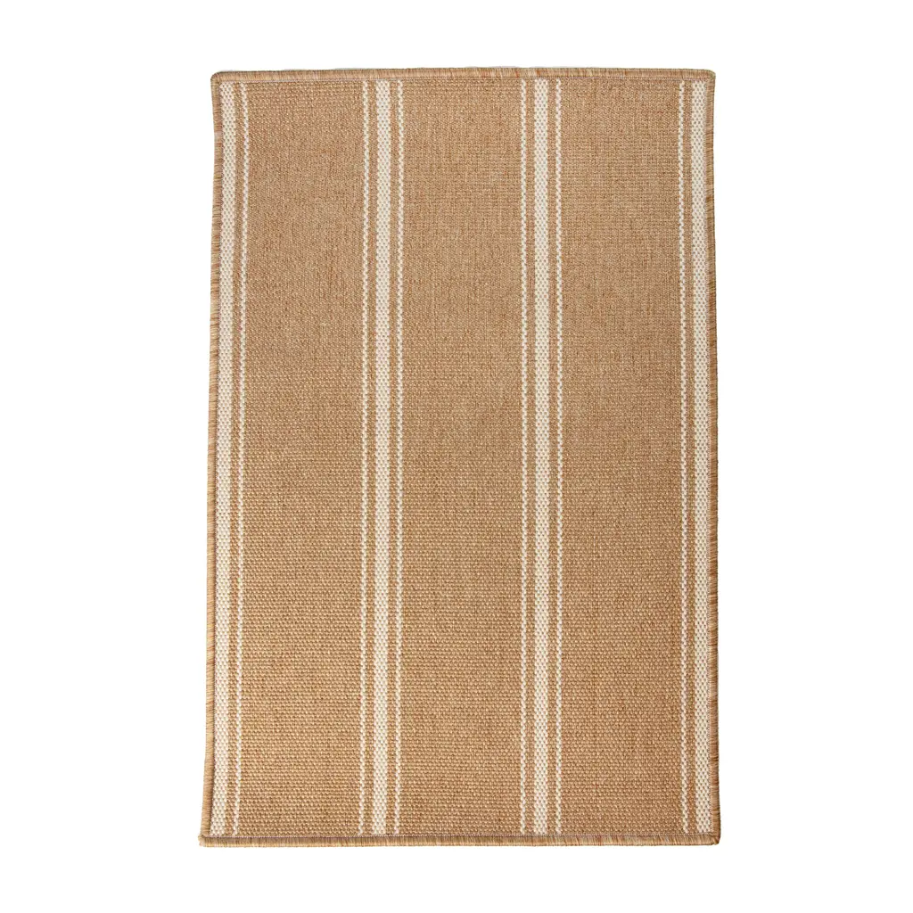 This Oakridge Custom carpet from India is a hand-loomed beauty. The background with vertical brown stripes creates a classic design. The woven texture gives it a natural appearance, made of 100% SD UV polypropylene for quality and durability.