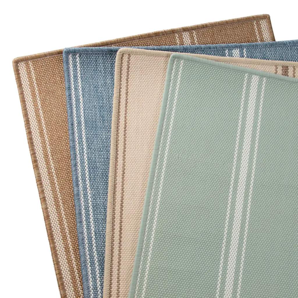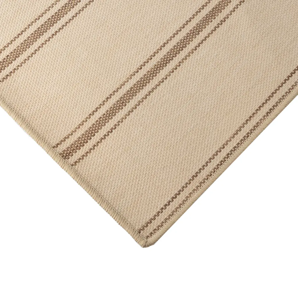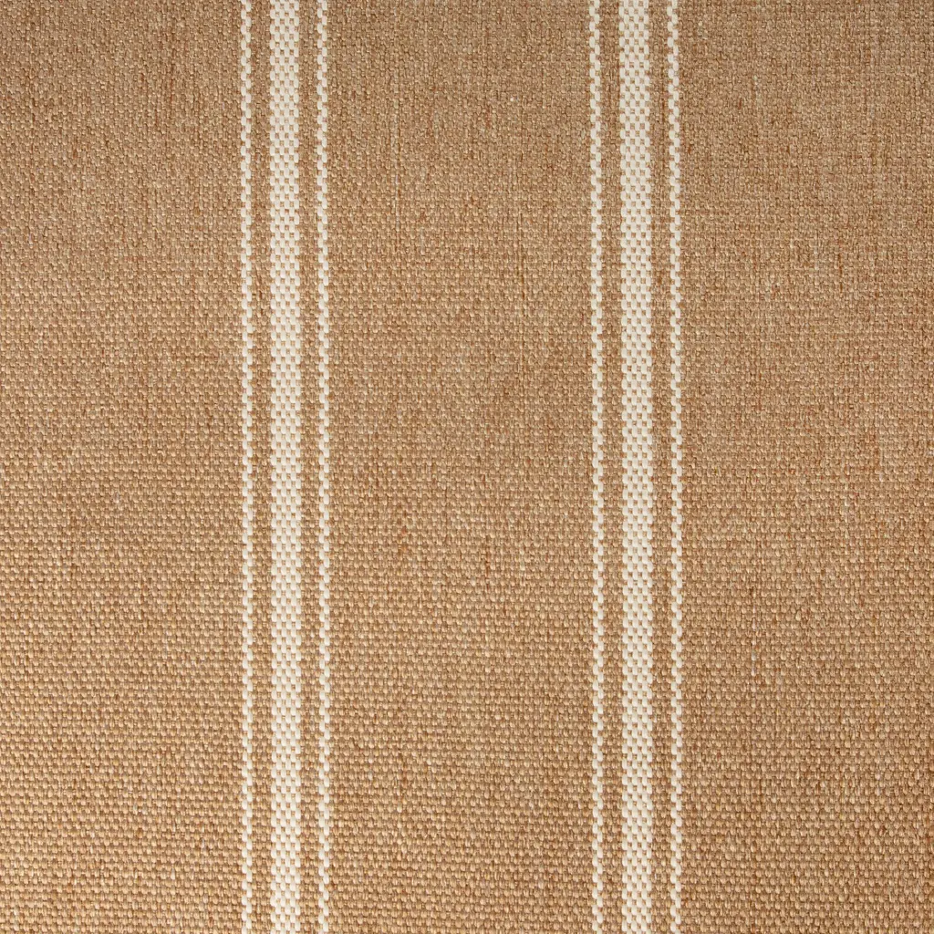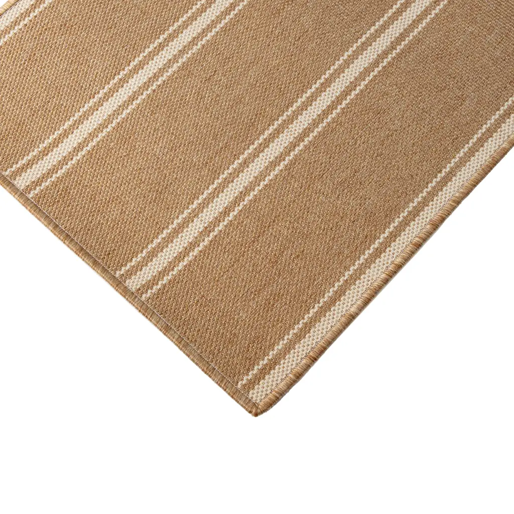 This Oakridge Custom carpet from India is a hand-loomed beauty. The background with vertical brown stripes creates a classic design. The woven texture gives it a natural appearance, made of 100% SD UV polypropylene for quality and durability.