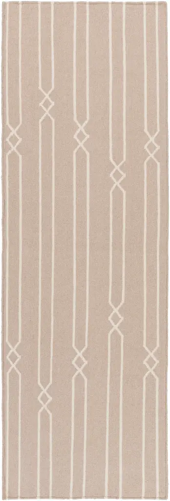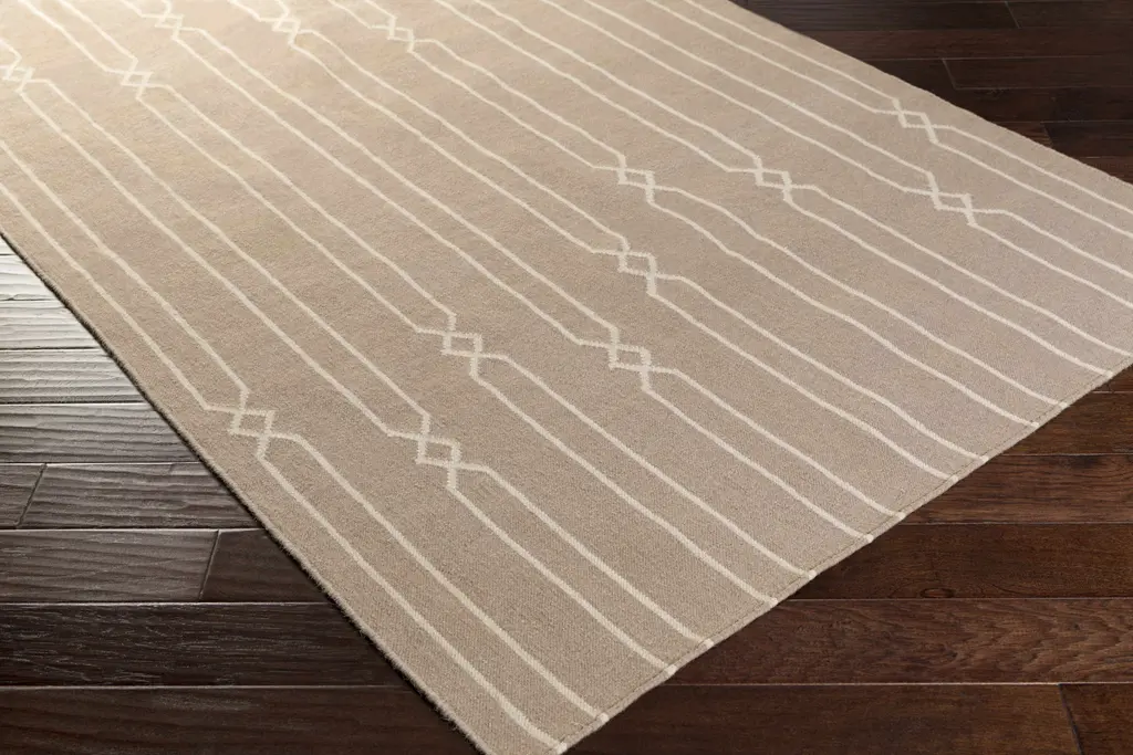 Collection: Oundle Colors: Gray, Peach Construction: Hand Woven Material: 100% Wool Pile: No Pile Styles: Contemporary Made In: India Thickness: 0.16" Price Range: $$$$$ (Most Affordable)