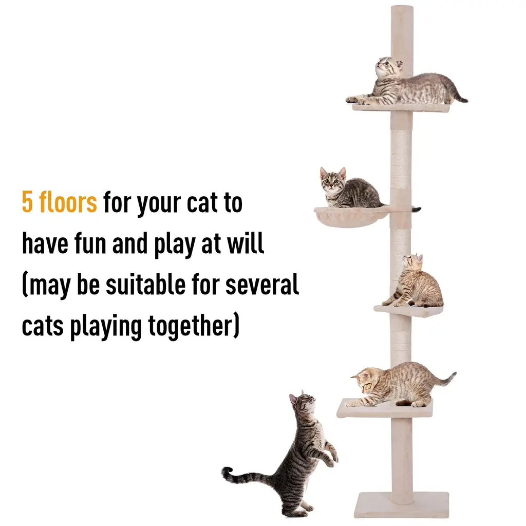 Give your furry friends a place of their own with this 5-tier ceiling to floor cat climbing tree. With multiple platforms to lounge and bask on, this multi-tiered cat tree is the purr-fect solution for homes with more than one frisky feline! The middle post features scratching areas, offering them plenty of places to stretch and exercise their claws. With multiple platforms to choose from, your little ones are bound to have an absolute blast with this easy-to-install cat tree! Features: - Unique design features multiple platforms to give your frisky felines plenty of space to lounge and play - 90.5''-102.25'' adjustable height, can be secured to the ceiling using the included tension rod for added safety - Made with 220gsm short plush covers for added durability and long-lasting wear - Encourages appropriate scratching and allows your cat to remove the dull nail sheath to reveal healthy paws - Solid P2 grade particle board construction keeps the whole cat tree strong and stable, non-toxic and pet friendly - 3.5" diameter paper tube, wider and stronger than other sellers, provides better stability - Easy assembly required NOTE: This cat tower need to be attached to the ceiling for added safety and is designed for ceilings under 90.5''-102.25'' feet in height. Specifications: - Color:Beige/Grey - Material:P2 Grade Particle Board, Short Plush, Sisal - Overall Dimension:15.75"L x13.5"W x 90.5''-102.25'' - 1st Tier Size(Bottom):15.75"L x 13.5"W - 2nd Tier Size:15.75"L x 11.75"W - 3rd Tier Size:Φ11.75" - 4th Tier Size:Φ11.75" - 5th Tier Size(Top):15.75"L x 11.75"W - Overall Weight Capacity:33lbs - Each Platform Weight Capacity:17.6lbs