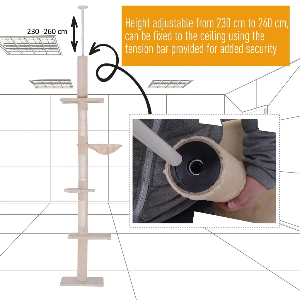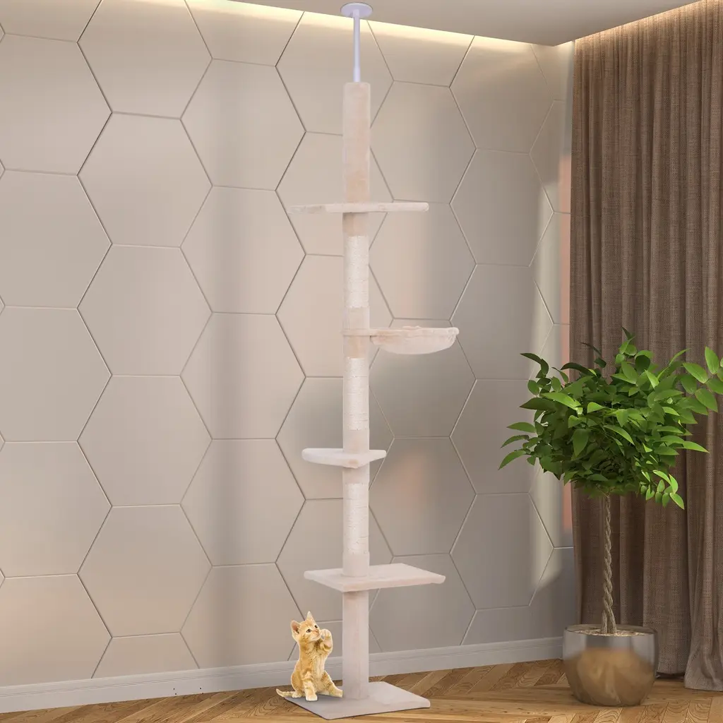 Pawhut 8.5' Adjustable Height Floor-To-Ceiling Vertical Cat Tree With 5 Carpeted Platforms & 3 Sisal Rope Scratching Areas - Beige