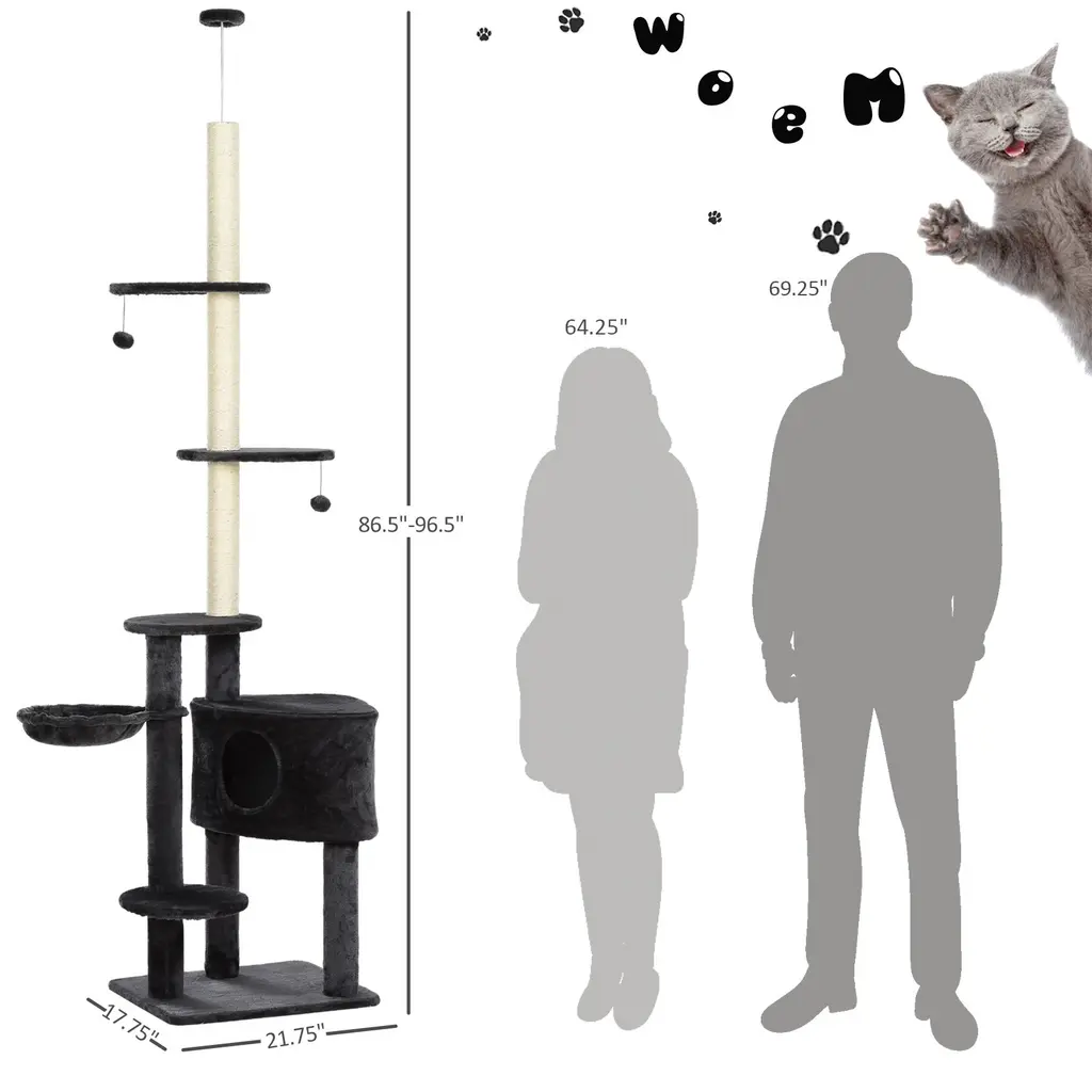 ACTIVITY CENTER: This floor-to-ceiling cat tree ranges in height from 86.5"-96.5" and can be secured to the ceiling using the included tension rod. The tree also features a condo, side bed, and several jumping platforms for cats to explore more fun.CATS'PARADISE: this cat tower has a sisal scratching post separated by 2 cozy perches which helps cats encourage positive scratching behavior and protects furniture from damages caused by cats'scratching.STABLE & STURDY: The cat house is made of sturdy particleboard, and features a 21.75''x 17.75''baseboard to avoid wobbling or tipping over. This is perfect for 2-3 cats around ~10 lbs. Furthermore, we have included an anti-toppling device for extra stabilityWARM CUSHION: Soft 400gsm short plush covers are on all the boards of this cat condo, offering your cat a warm and soft touch, keeping them comfortable while sleeping or playing.OVERALL DIMENSION: 21.75" W x 17.75" D x 86.5 - 96.5" H, Weight Capacity: 66 lbs