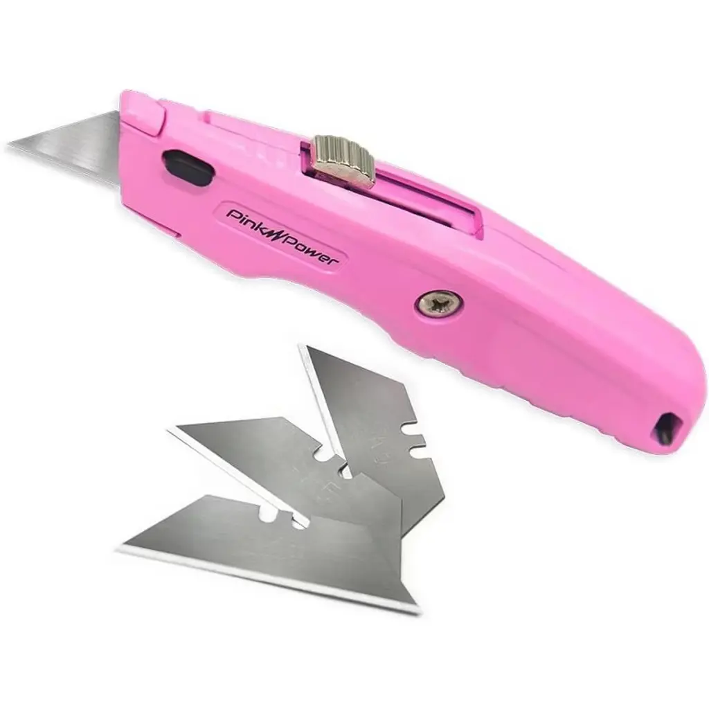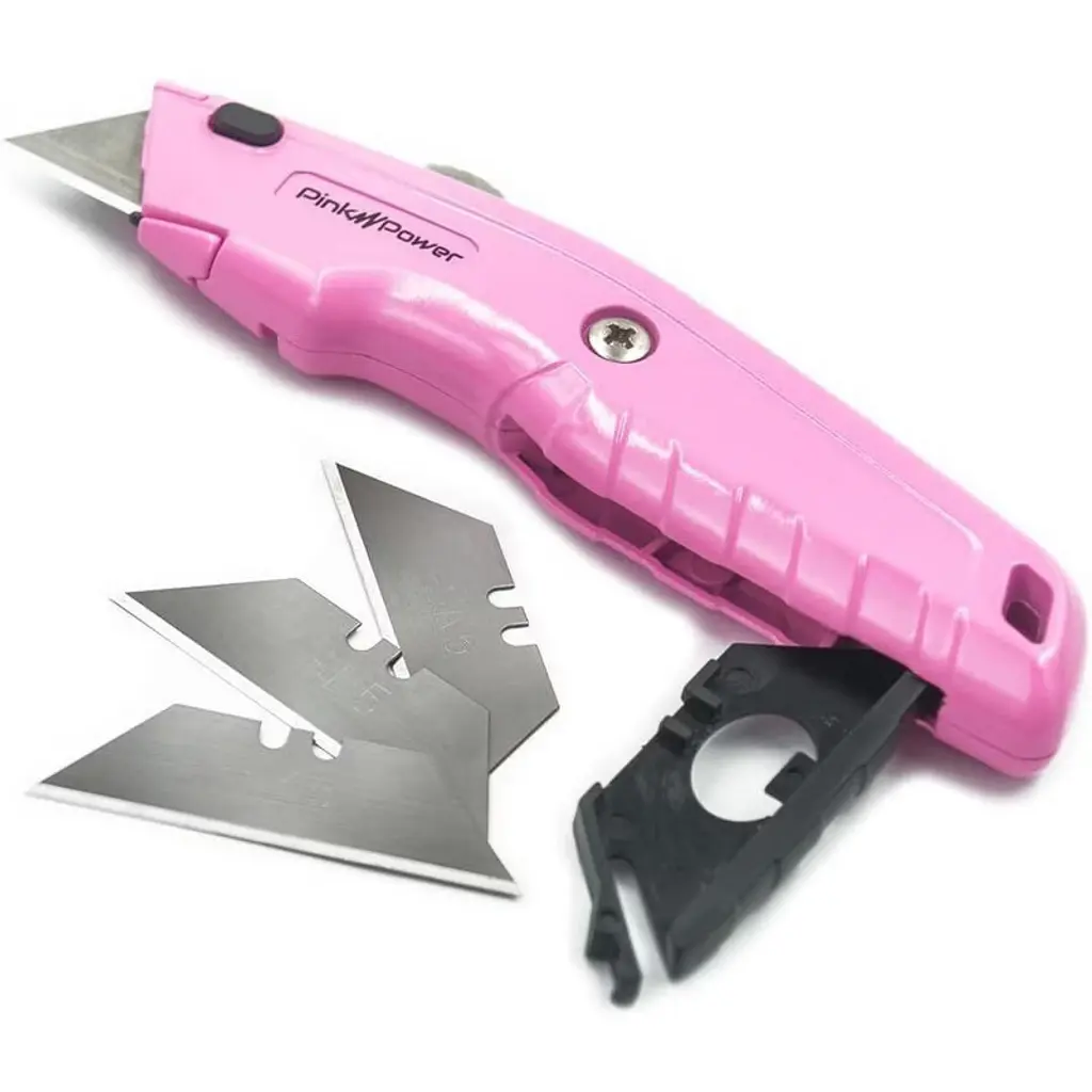 Pink Power Pink Box Cutter Retractable, Pink Utility Knife For Carpet, Cute Box Cutter Knife Heavy Duty With 3 Blades And Storage Compartment