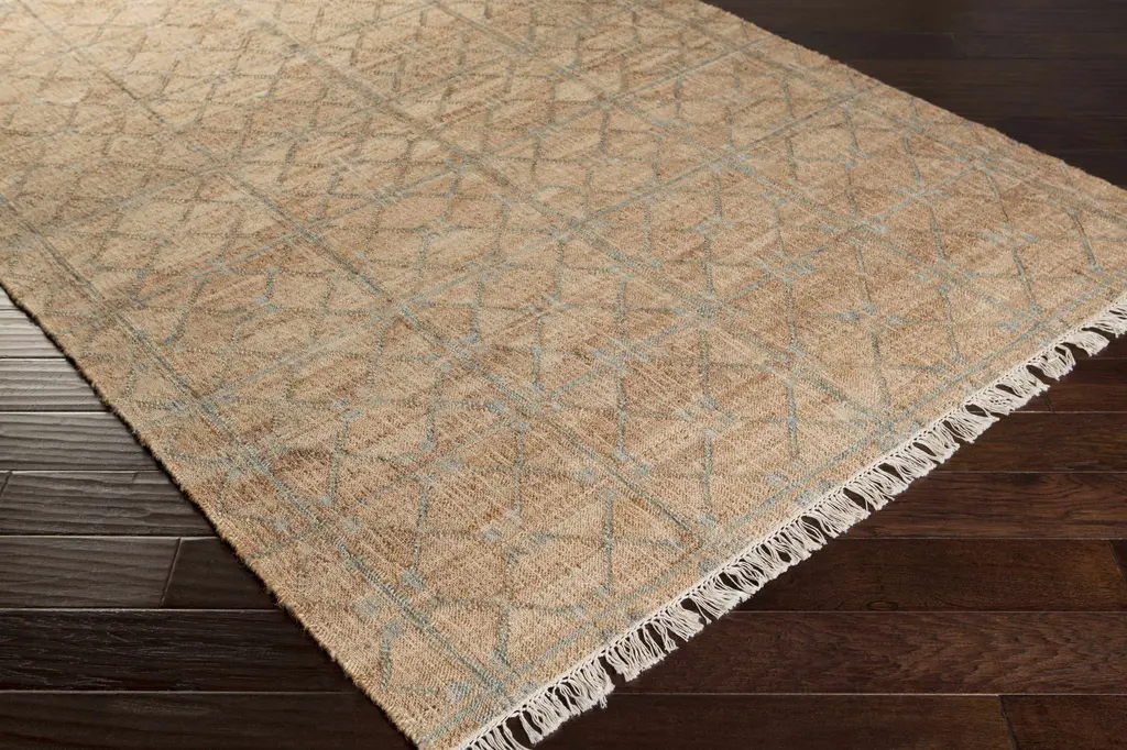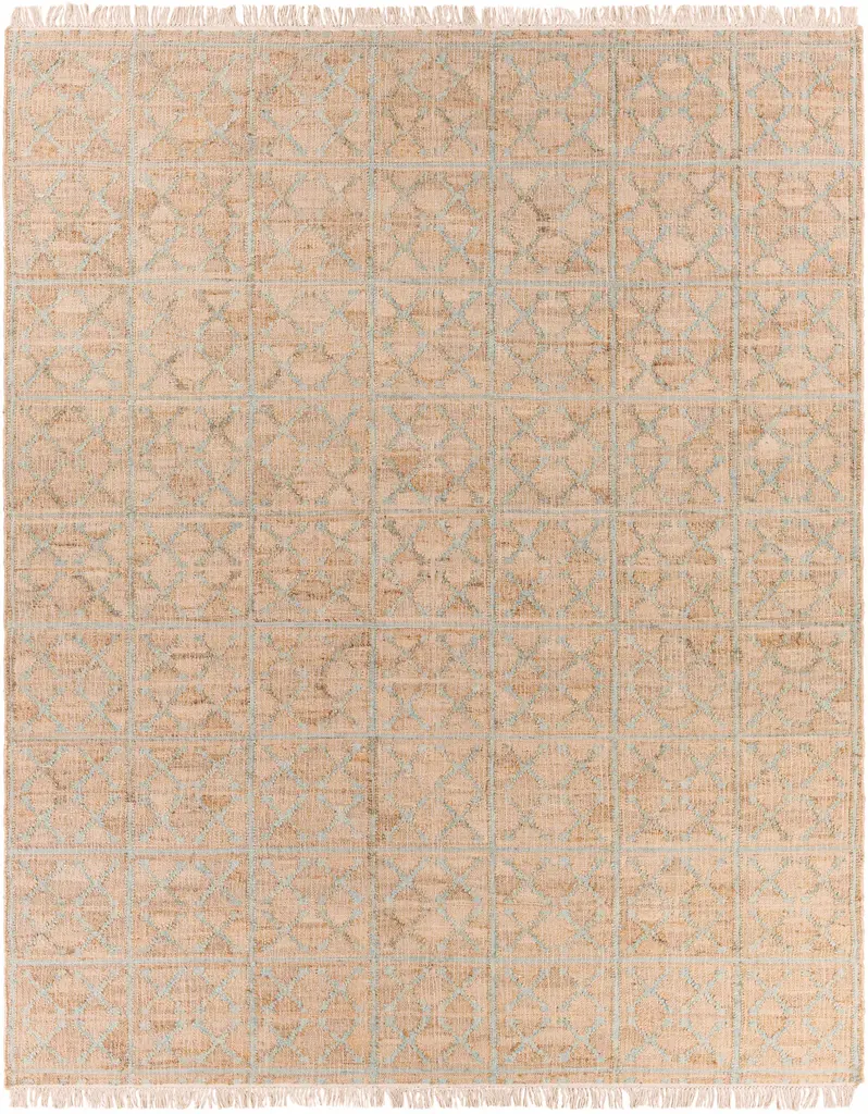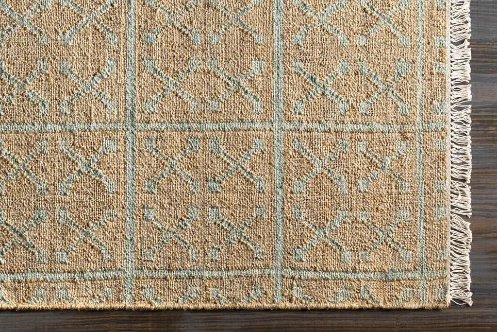 Collection: Rice Dusty Sage Colors: Cream, Tan, Dusty Sage Construction: Hand Woven Material: 100% Jute Pile: No Pile Styles: Transitional,Traditional Made In: India Thickness: 0.07" Fringe Length: 1.5" Price Range: $$$$$ (Affordable)