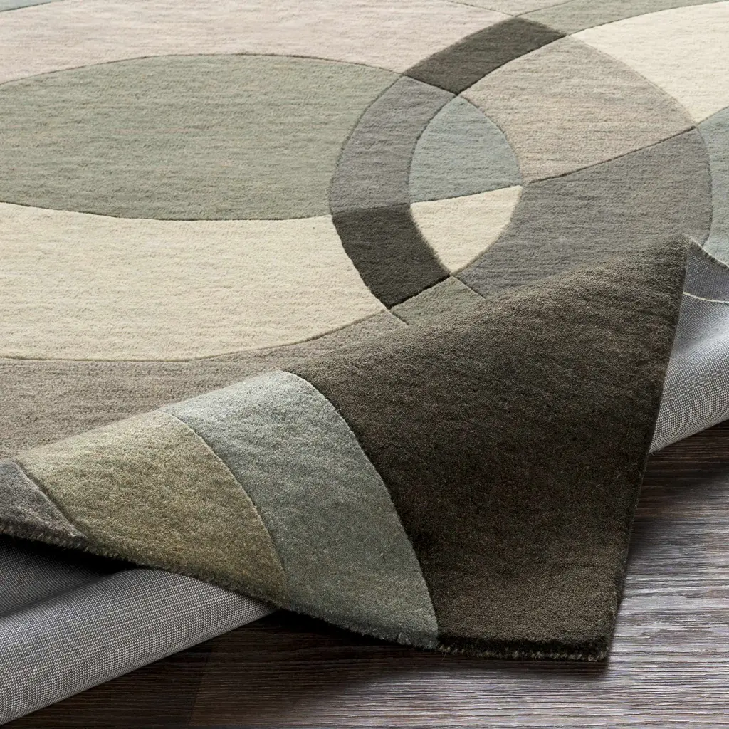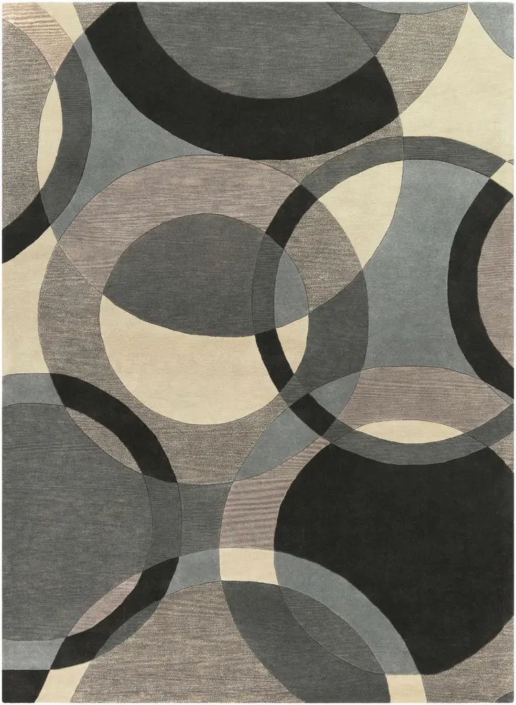Collection: Pitman Colors: Charcoal, Black, Taupe, Gray, Teal Construction: Hand Tufted Material: 100% Wool Pile: Medium Pile Pile Height: 0.39" Styles: Contemporary Backing: Canvas Made In: India Thickness: 0.86" Price Range: $$$$$ (Affordable)