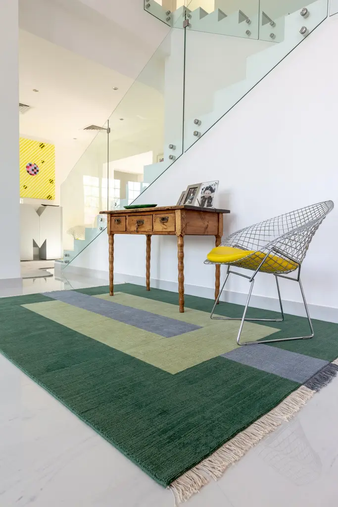 Design Title: "Plain Green"This carpet is woven on a hand/loom in a technique called 'tip shear' which gives a beautiful texture and a soft feeling on the surface.Carpets CC is the carpet design brand of Cecilia Setterdahl. She uses bold colors and geometrical combinations to create bespoke carpets.Cecilia is based in Dubai since 2015.Available in a per square meter priceFlatweave - Tip Sheared CarpetWoolSoft and supple, watch attached sample videoThickness: abt 10MMwith FringesSize: 170x240cmUnlimited Edition