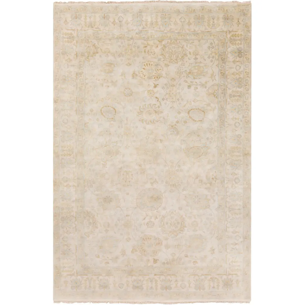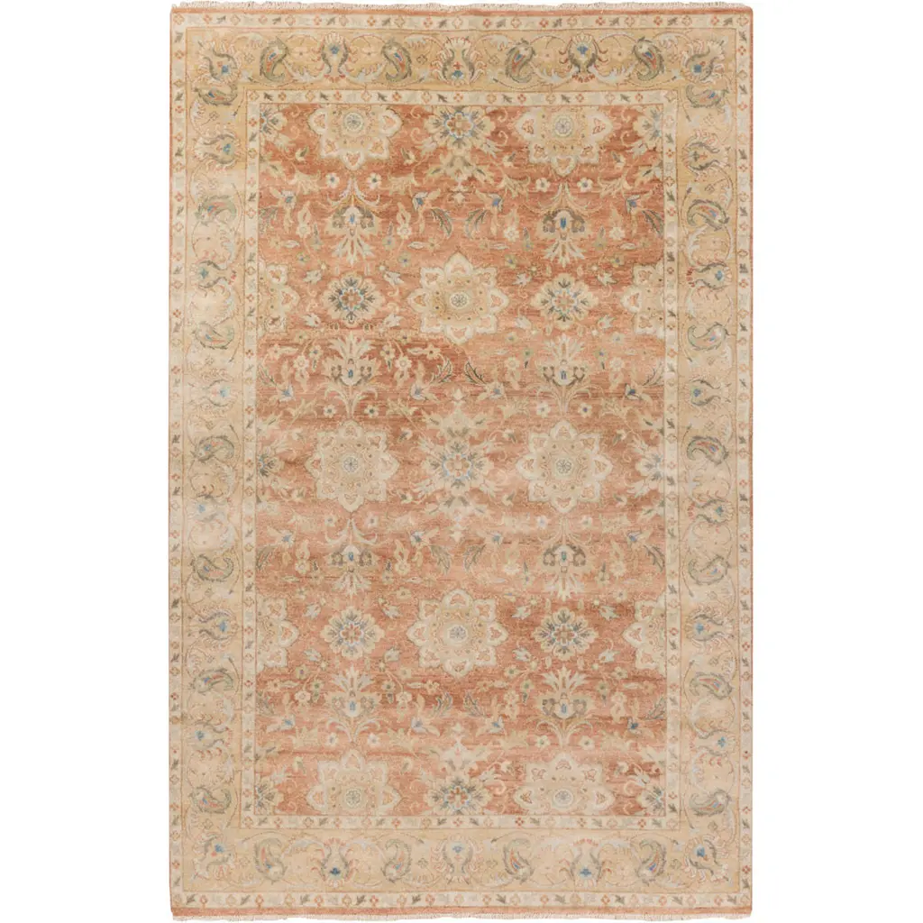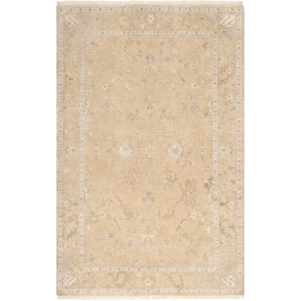 Collection: Springerville Colors: Peach, Tan, Medium Gray, Beige, Blue, Mustard, Pale Pink Construction: Hand Knotted Material: 100% NZ Wool Pile: Medium Pile Pile Height: 0.39" Styles: Traditional Made In: India Thickness: 0.47" Price Range: $$$$$ (Premium)