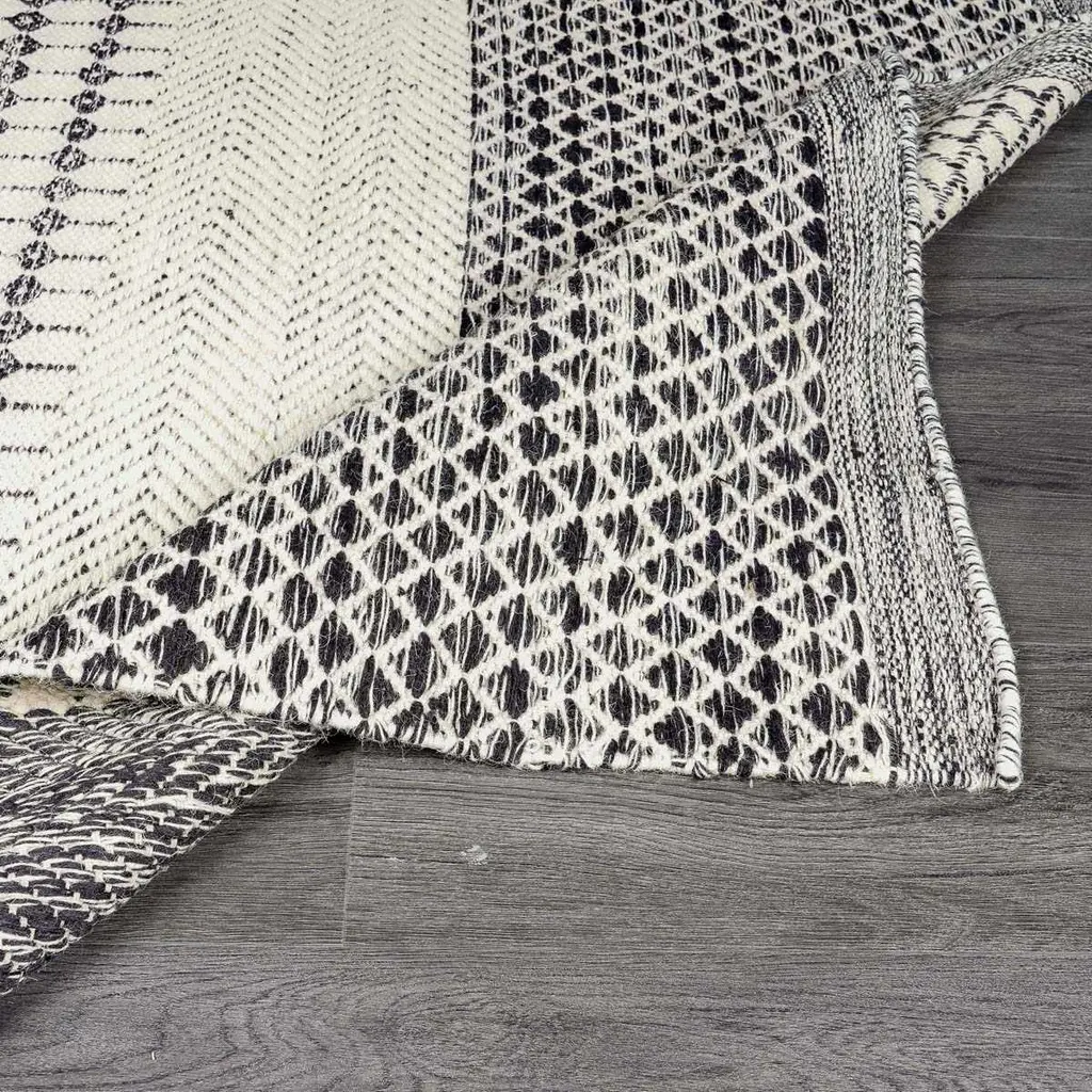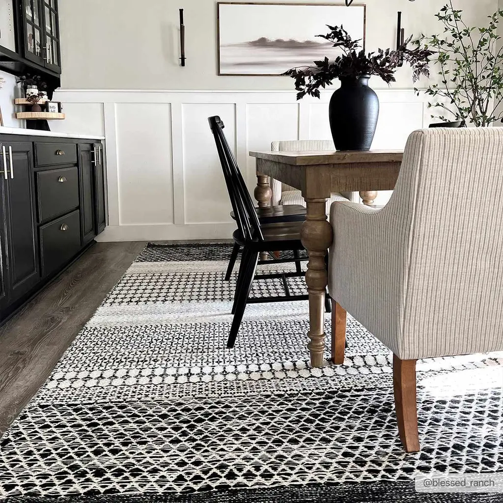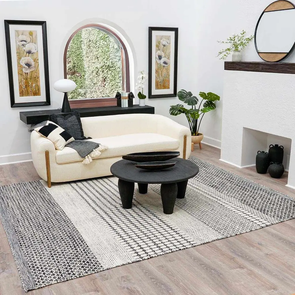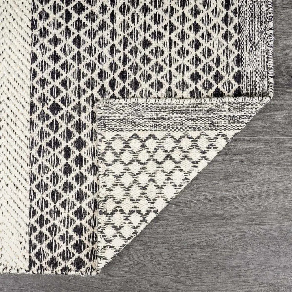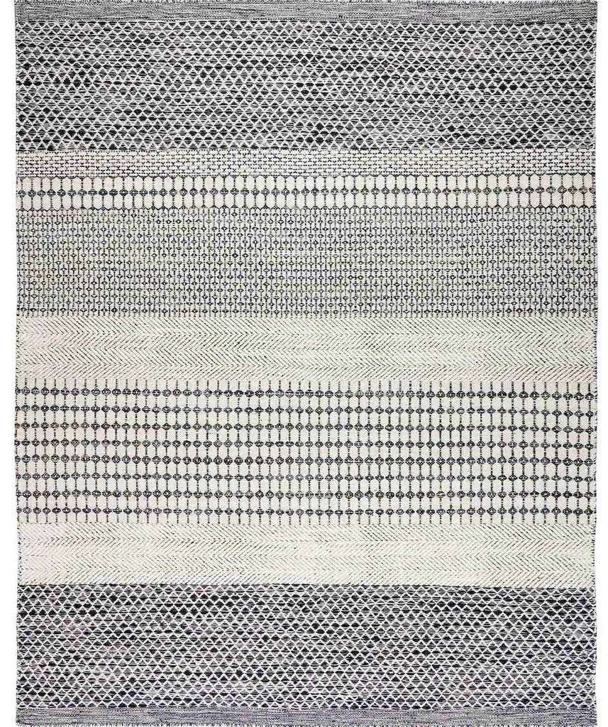 Collection: Tideswell Colors: Black, Beige Construction: Hand Woven Material: 100% Wool Pile: No Pile Styles: Transitional,Bohemian Made In: India Thickness: 0.4" Price Range: $$$$$ (Affordable)