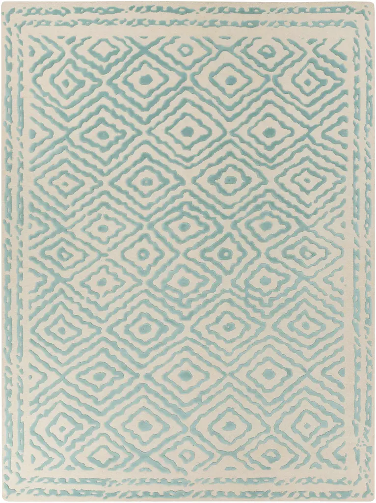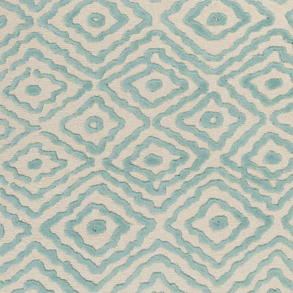Collection: Tuskahoma Colors: Aqua, Peach Construction: Hand Knotted Material: 100% Wool Pile: Medium Pile Pile Height: 0.39" Styles: Contemporary Made In: India Thickness: 0.47" Price Range: $$$$$ (Affordable)