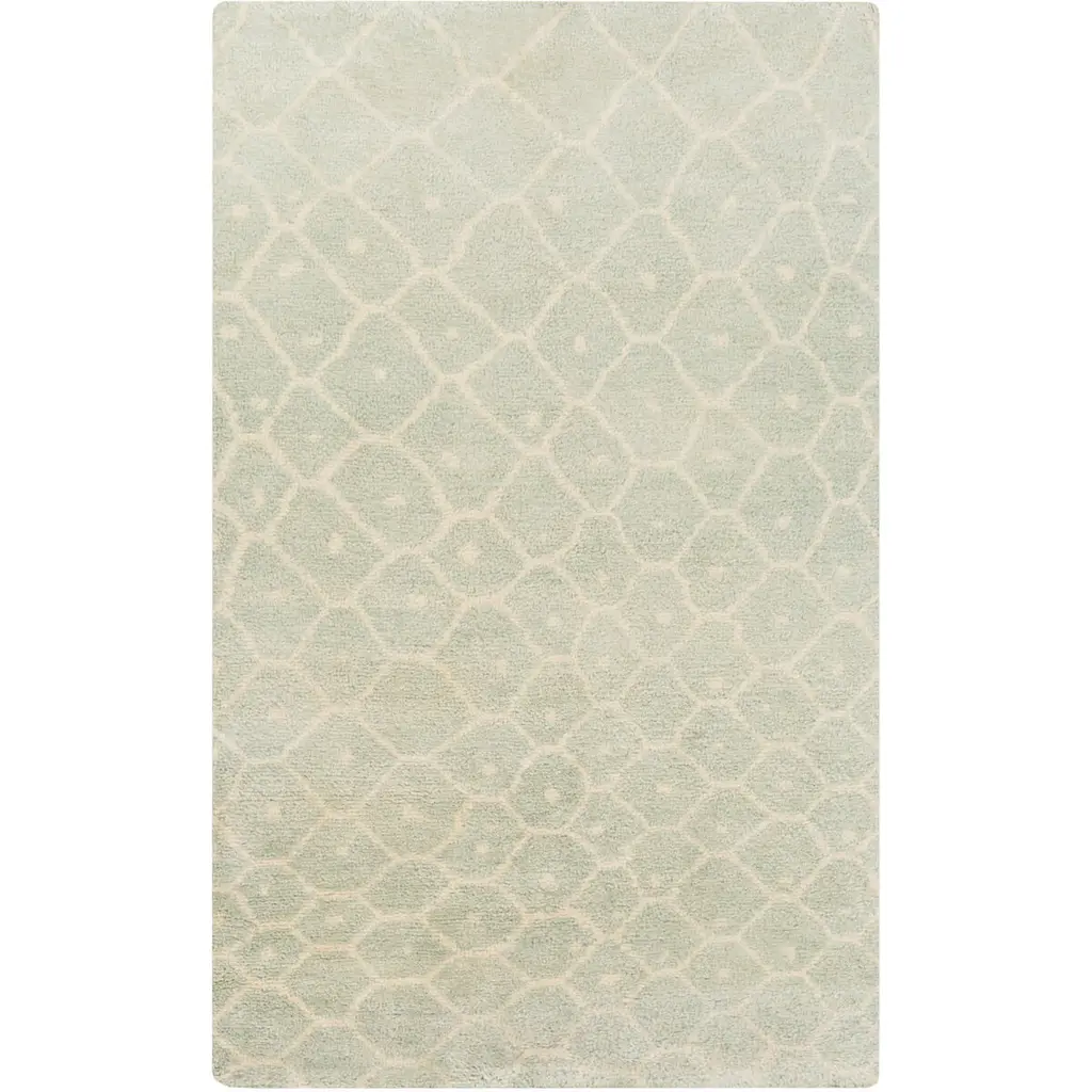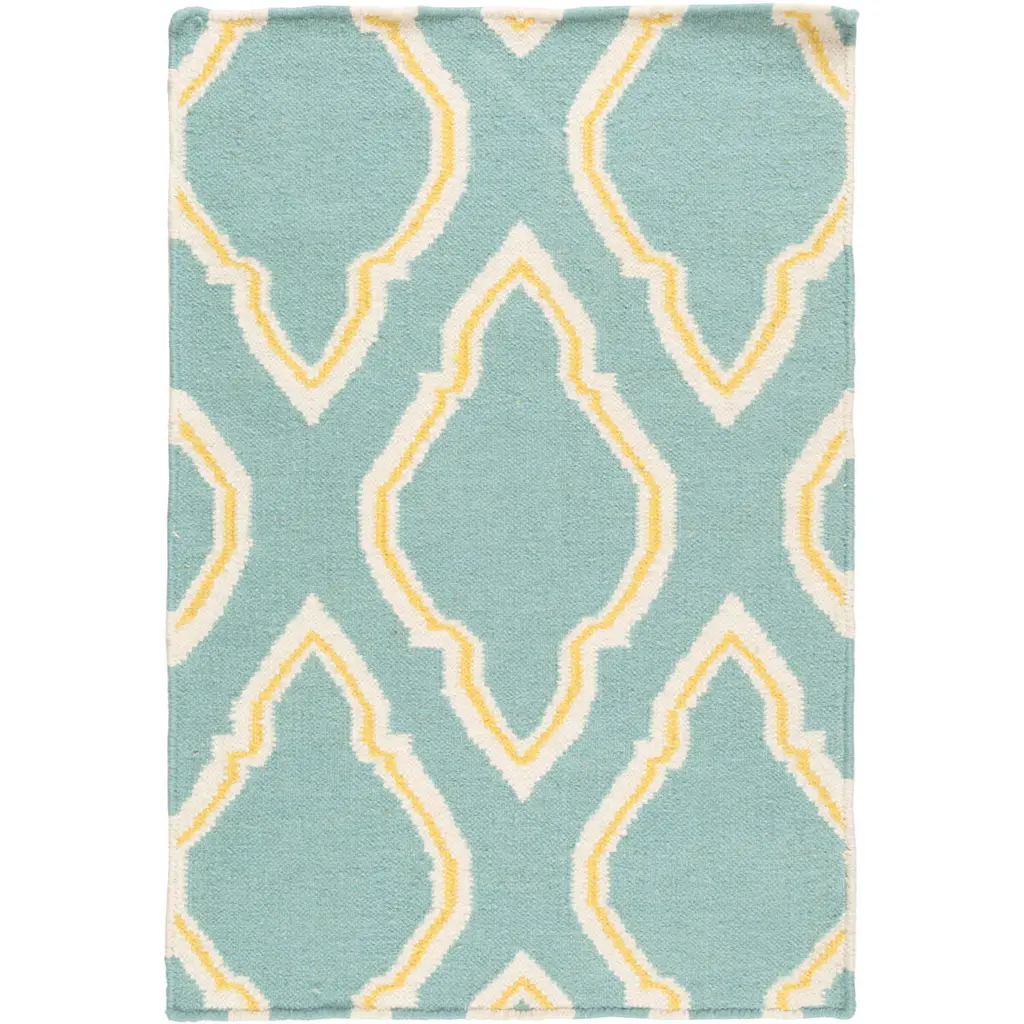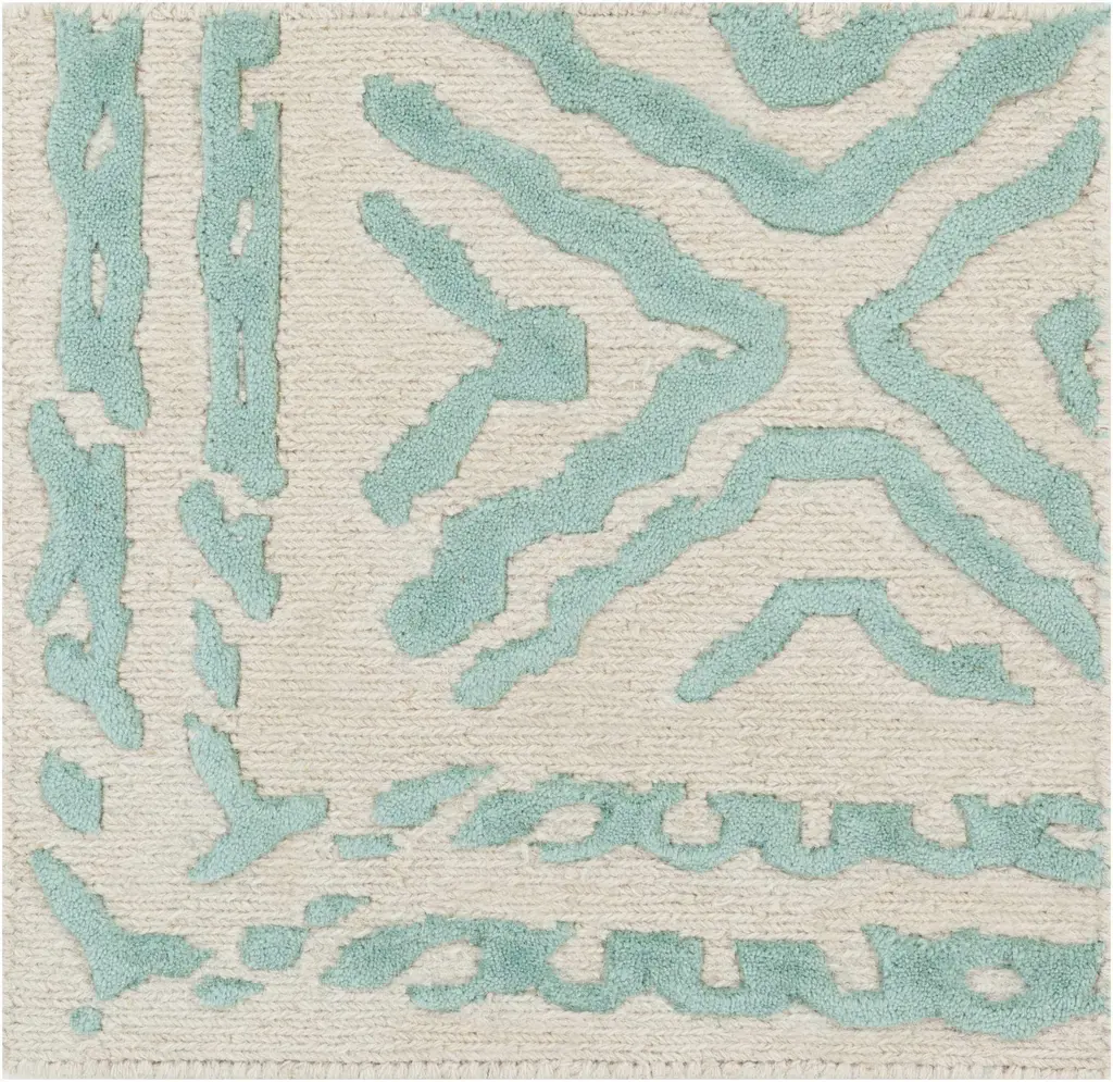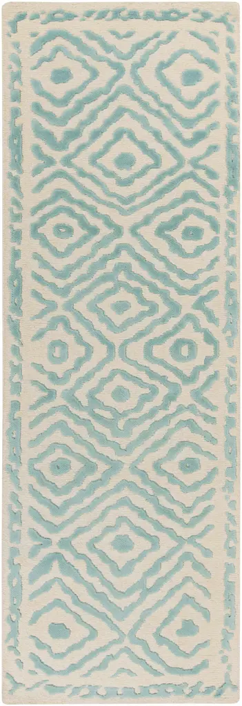 Collection: Tuskahoma Colors: Aqua, Peach Construction: Hand Knotted Material: 100% Wool Pile: Medium Pile Pile Height: 0.39" Styles: Contemporary Made In: India Thickness: 0.47" Price Range: $$$$$ (Affordable)