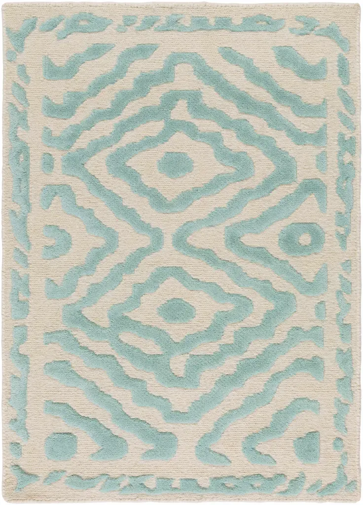 Collection: Tuskahoma Colors: Aqua, Peach Construction: Hand Knotted Material: 100% Wool Pile: Medium Pile Pile Height: 0.39" Styles: Contemporary Made In: India Thickness: 0.47" Price Range: $$$$$ (Affordable)
