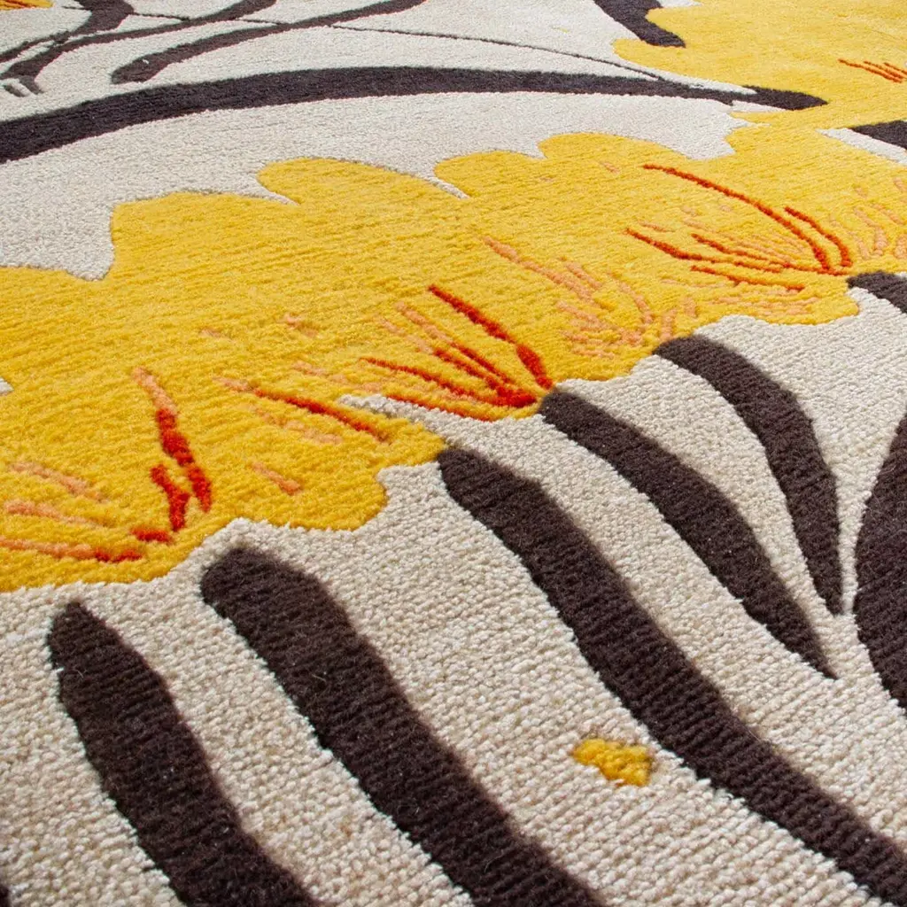 The elegant and sinuous lines designed by René Gruau for Fede Cheti represent a modern floral motif inspired by traditional Japanese prints. The Valparaise rug, available in two color variations – white and yellow – is the result of the elaboration of the Artist’s beloved subjects and their translation into a refined and unmistakable artifact. The carpet is made of New Zealand wool (70%) and pure silk (30%).