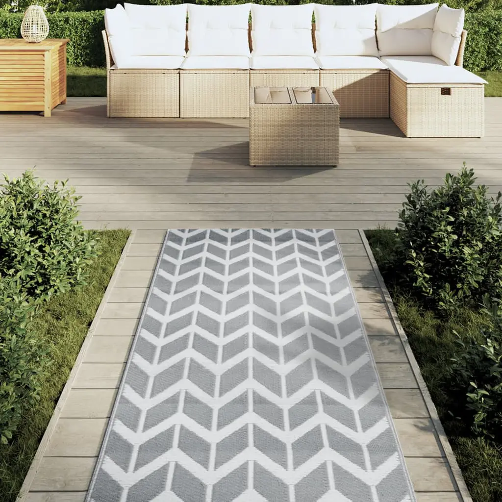 This outdoor carpet measures 31.5 in by 98.4 in and is crafted from high-quality polypropylene, designed to withstand various elements while maintaining its beauty. With its modern chevron pattern in a sleek grey, this carpet is the perfect addition to enhance your outdoor space, whether you're using it on a balcony, patio, or garden area, providing a stylish and comfortable surface that invites relaxation and enjoyment in the fresh air. UV Resistant: The polypropylene materials are treated to resist fading and degradation from sunlight, keeping your carpet looking fab season after season. This feature lets you enjoy your outdoor space without worrying about color loss!Lightweight and Foldable: Grab this carpet and take it wherever you fancy; it’s lightweight, and you can fold it up for easy storage when not in use—great for limited storage or changing your outdoor style.Versatile Use: This carpet works in loads of places, perfect for gardens, terraces, patios, or for events. Its modern design is great for anyone looking to improve their outdoor experience.Water-Resistant Finish: The tightly woven polypropylene helps it resist water, drying quickly after rain. Your carpet stays looking good regardless of the weather!Easy Maintenance: Just wipe it with a damp cloth or rinse with a hose to keep it fresh and ready to use. Minimal cleaning means more time enjoying your outdoor space!