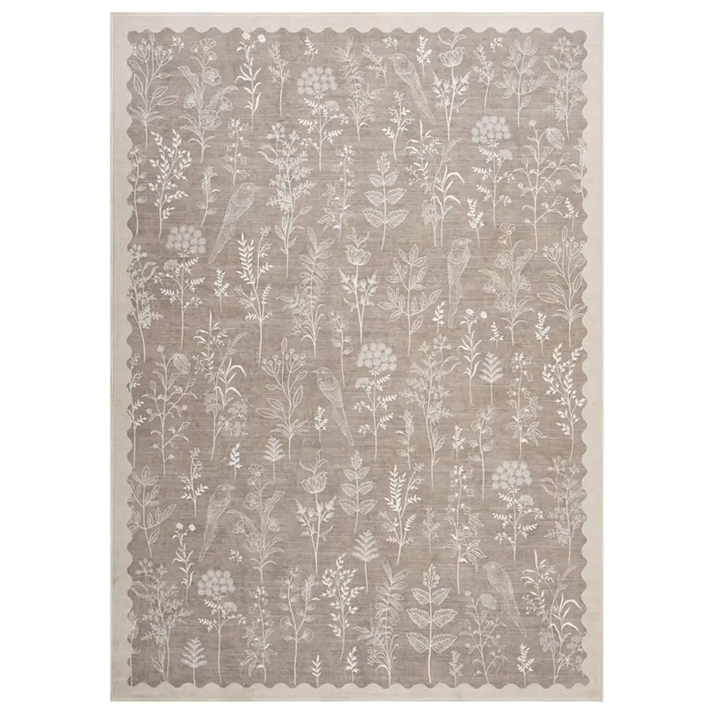Washable Area Rugs for Living Room, Scalloped Floral Bedroom Rug, Non-Slip Stain Resistant Dining Table Carpet, Botanical Large Rug Neutral Carpet