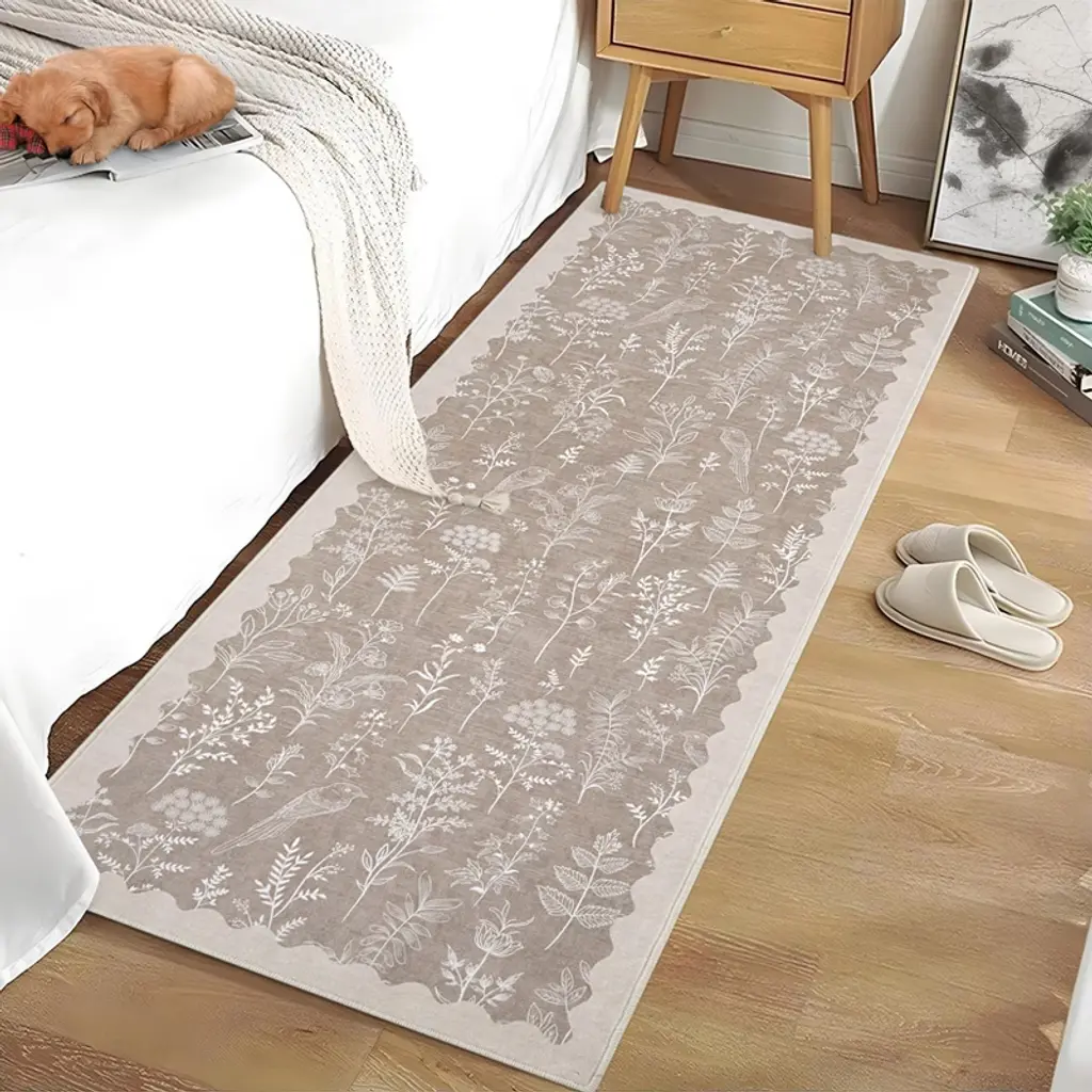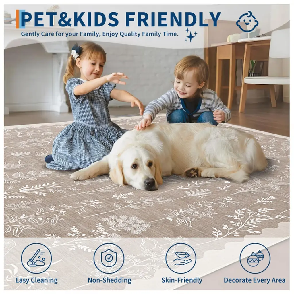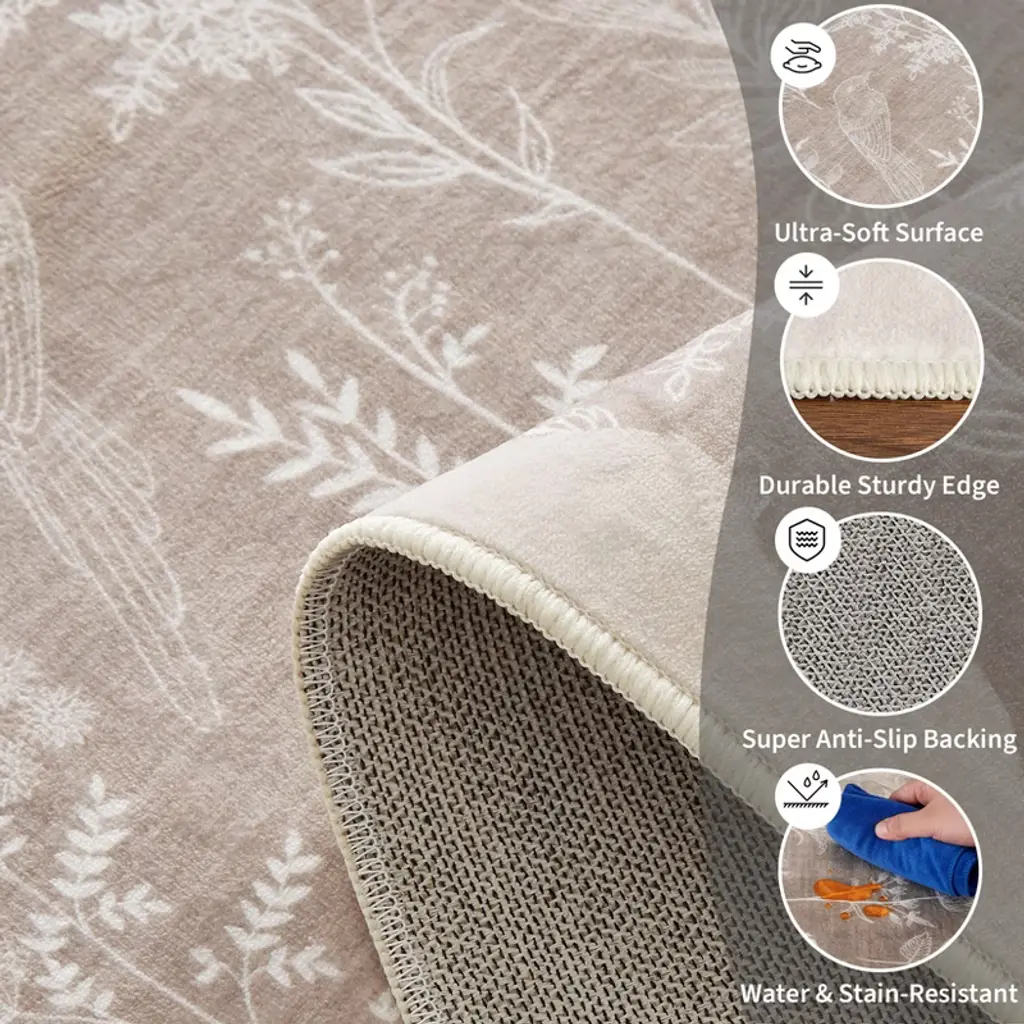 Washable Area Rugs for Living Room, Scalloped Floral Bedroom Rug, Non-Slip Stain Resistant Dining Table Carpet, Botanical Large Rug Neutral Carpet