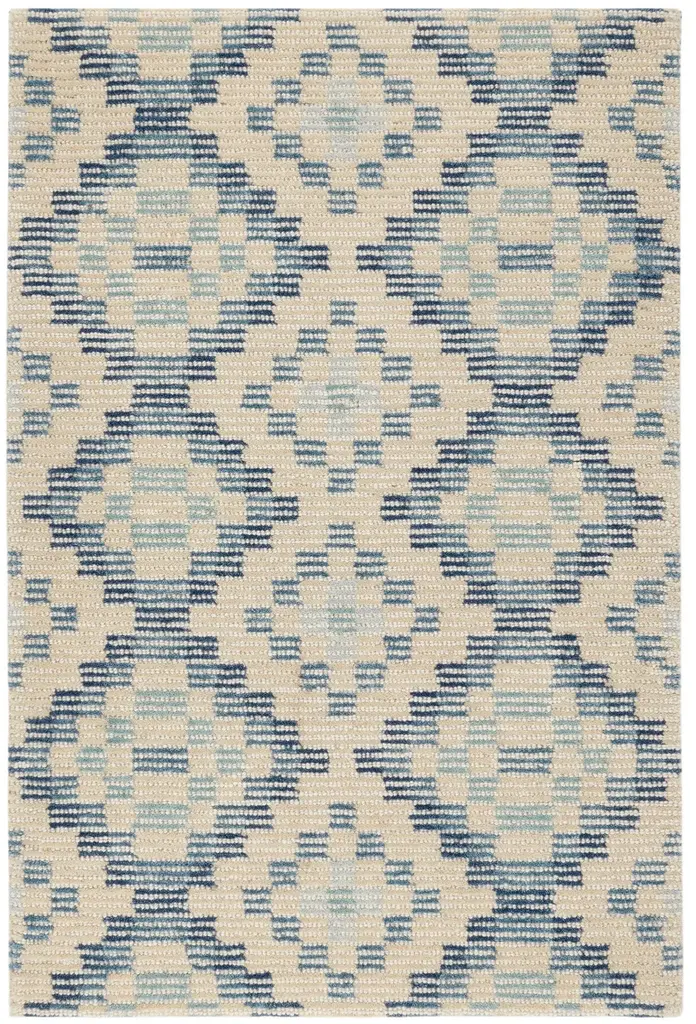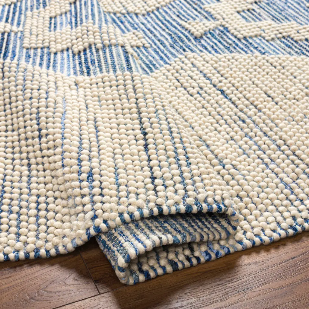 Collection: Ziya Colors: Navy, Light Blue, Charcoal, Medium Gray, Off White Construction: Hand Woven Material: 70% Cotton,30% Wool Pile: High Pile Pile Height: 0.79" Styles: Transitional,Bohemian Made In: India Thickness: 0.98" Price Range: $$$$$ (Affordable)