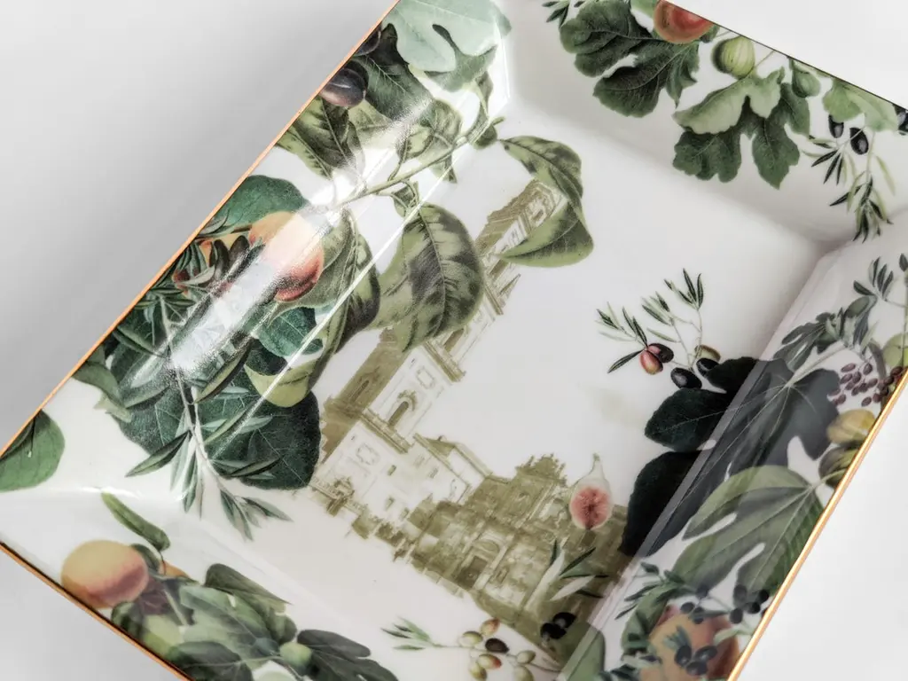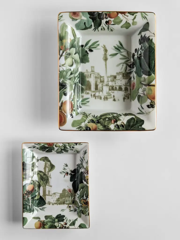 A set of two porcelain pocket emptiers/ashtray with a classic shape and unique printed design. This collection is inspired by Vito's hometown in south Italy, Puglia. The design is focused on Puglia's iconic monuments, surrounded by branches of olive trees, fig and apricot trees.Set of 2Measures: Large 19.5 x 16 x 4cmSmall 15 x 11.5 x 2.5cm.