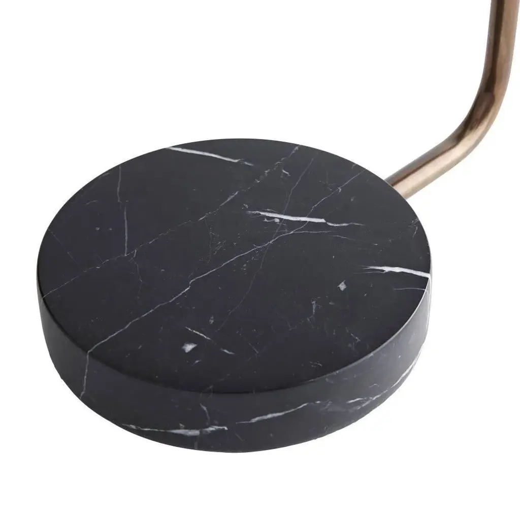 This contemporary lamp possesses a modern sensibility defined by a sleek style and masterly materials. A heritage brass steel frame wrapped in gray leather seamlessly blends into a circular black marble base—a beautiful balance between natural and refined elements. The taupe cloth cord features a dimmable switch so you can create an ambiance that suits you. A bronze metal drum shade tops this modish luminescent. Shade Dimensions: Bottom 9.5" x Top 9.5" x Side 3"