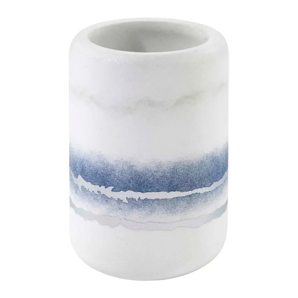 The Avanti Murano 4-Piece Bath Accessory Set features a marble-look with a matte white base with light grey, dark grey and silver horizontal bands. Made of durable resin. Set includes one each of tumbler, toothbrush holder, soap dish and lotion dispenser. Imported.