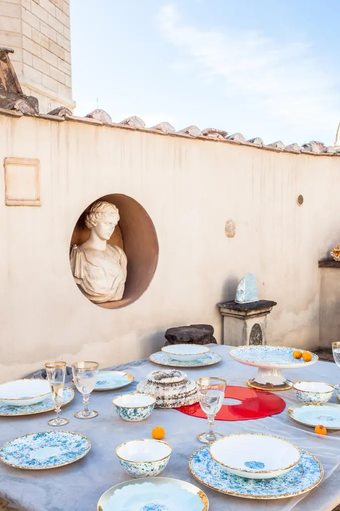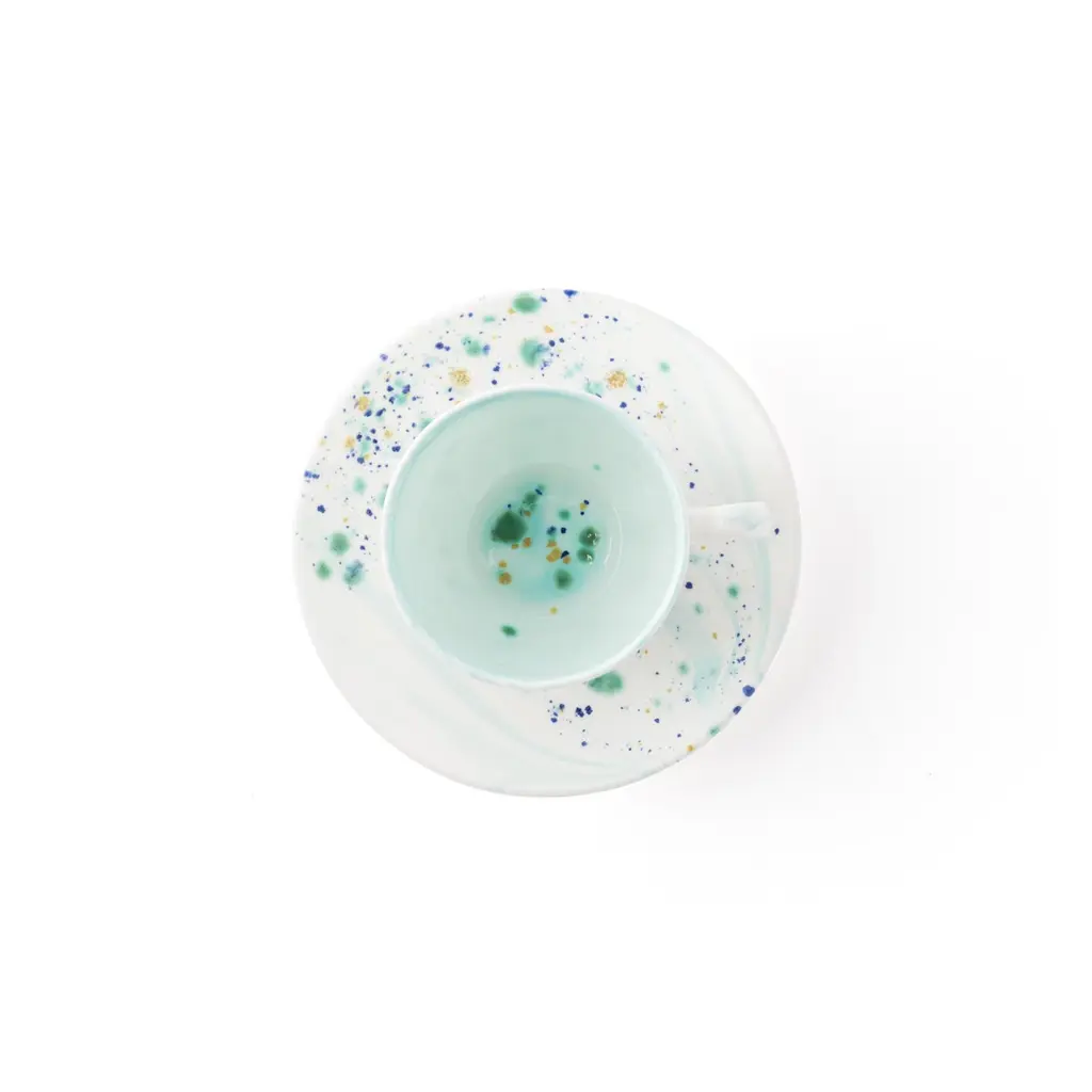 Handcrafted in Italy from the finest porcelain, this blue marble tea cup and saucer is entirely decorated with a dotted blue yellow and green enamel.Set of 2 teacups and saucer, 10clPiazza del Popolo, Blue Marble collectionHand painted porcelainMade in ItalyFirst introduced at Milan Design Week 2018, the Piazza del Popolo collection is named after a Roman landmark, at the heart of Roman everyday life, and inspired by traditional, simple Italian artisanal pottery yet decorated in a personal and elegant key. Each Coralla Maiuri product is entirely hand decorated. Each is a work of art. While ensuring consistency, they are never identical. Slight variations of decor and color from one to another are not only normal, but to be expected as a sign of their uniqueness.Other sizes are available for the blue marble collection, please refer to other listings under the Coralla Maiuri brand.For large quantities, production lead time to be confirmed.Dishwasher and microwave oven safe