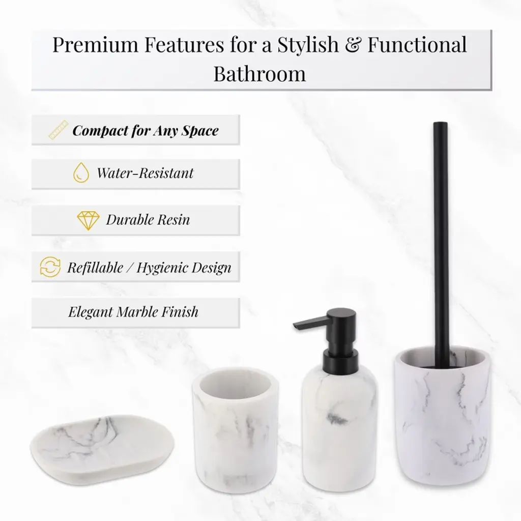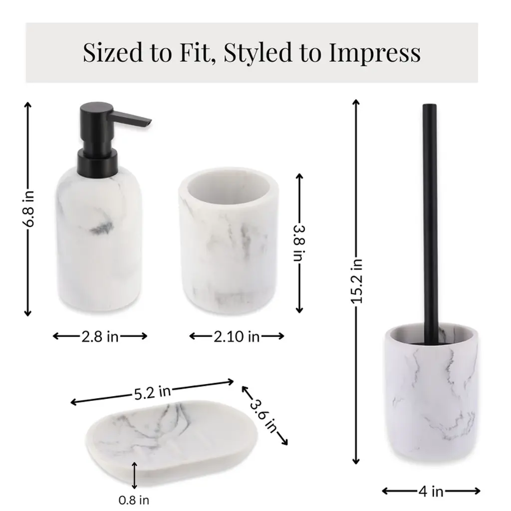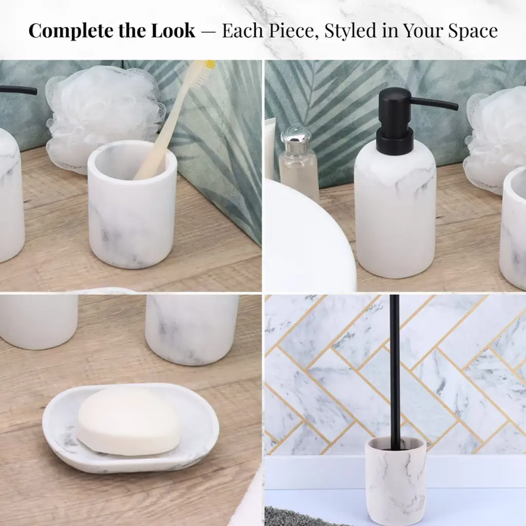 Elevate your space with our 4-Piece Marble Bathroom Accessories Set, with elegant black accents for a modern look. This bathroom decor includes a soap dispenser, toothbrush holder, soap dish and toilet brush for complete home organization. Moreover, the marble effect offers a luxurious touch that complements classic and contemporary interiors. Additionally, the durable resin construction resists water, cracks and daily wear and tear, ensuring lasting beauty and strength. Furthermore, the compact sizes are perfect for if you need a space-saving solution. Also, each piece is easy to clean with smooth, non-porous surfaces that wipe clean in seconds. However, each accessory offers full functionality for daily bathroom routines. Besides that, the sleek black pump and brush handle add a bold contrast to the soft marble design. The soap dish and tumbler feature natural marble veins for an authentic finish. Plus, the refillable soap dispenser helps reduce waste while offering a hygienic handwashing experience. Your bathroom will stay organized, clean and stylish with minimal effort. This versatile bathroom organizer set is a smart choice for main bathrooms, guest baths or office spaces. Create a cohesive and polished look with this durable, functional and modern bathroom decor.