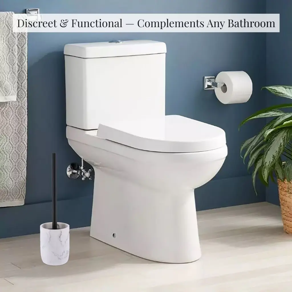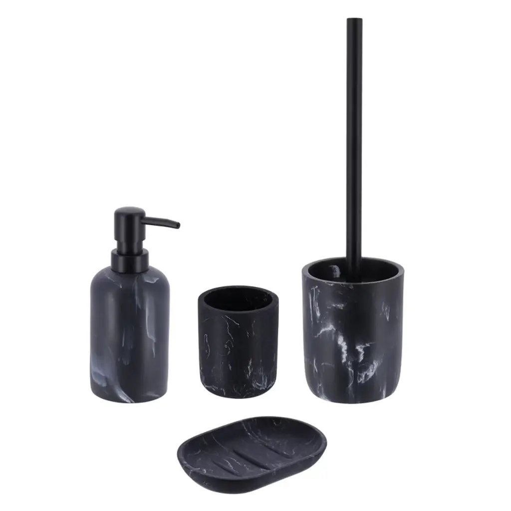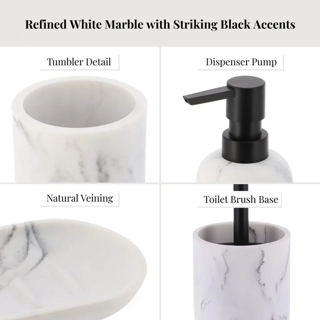 Elevate your space with our 4-Piece Marble Bathroom Accessories Set, with elegant black accents for a modern look. This bathroom decor includes a soap dispenser, toothbrush holder, soap dish and toilet brush for complete home organization. Moreover, the marble effect offers a luxurious touch that complements classic and contemporary interiors. Additionally, the durable resin construction resists water, cracks and daily wear and tear, ensuring lasting beauty and strength. Furthermore, the compact sizes are perfect for if you need a space-saving solution. Also, each piece is easy to clean with smooth, non-porous surfaces that wipe clean in seconds. However, each accessory offers full functionality for daily bathroom routines. Besides that, the sleek black pump and brush handle add a bold contrast to the soft marble design. The soap dish and tumbler feature natural marble veins for an authentic finish. Plus, the refillable soap dispenser helps reduce waste while offering a hygienic handwashing experience. Your bathroom will stay organized, clean and stylish with minimal effort. This versatile bathroom organizer set is a smart choice for main bathrooms, guest baths or office spaces. Create a cohesive and polished look with this durable, functional and modern bathroom decor.